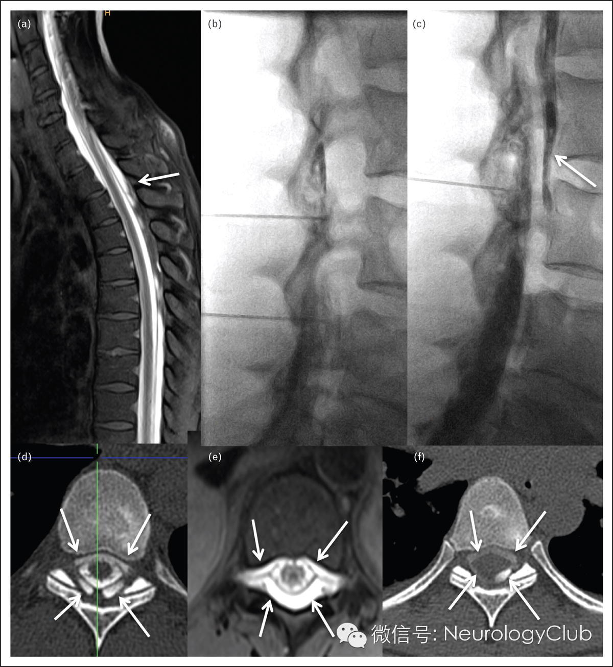 42岁女性,分娩时硬膜外麻醉继发低颅压,在X线引导下行硬膜外血贴术。三次盲法硬膜外血贴术后症状无明显好转。腰椎注射0.5ml钆剂和15ml Solutrast(一种水溶性对比剂)后行MR脊髓造影和CT脊髓造影。在胸椎节段(箭头,图a,d,e)可见最明显的硬膜外对比剂积聚。第二天,对比剂都已经集中于硬膜外腔中,但是仍有四个小孔(L4/5,L3/4,L2/3水平)需要确认造影剂是否到达胸段硬膜外腔中(图b,c)。图c中,对比剂充满了腹侧硬膜外腔(箭),在此位置数秒内注入35ml血液。在硬膜外血-对比剂注入后行T6/7水平CT扫描,证实血-造影剂进入到正确位置(箭,图f)。