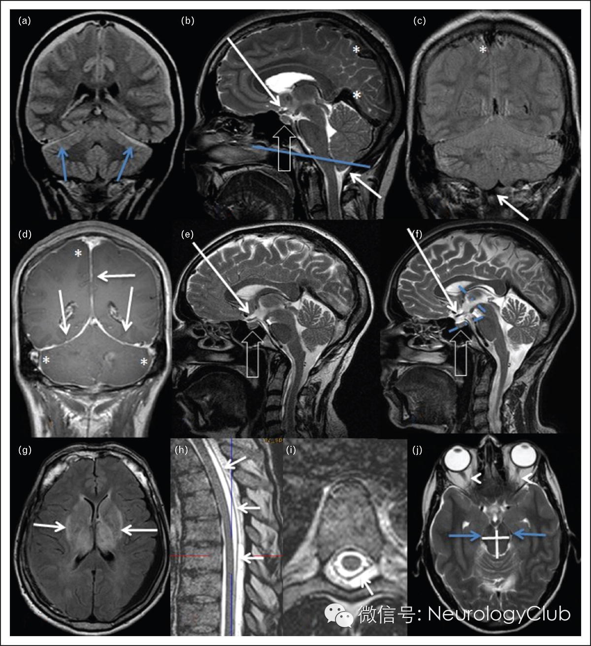 沿着大脑凸面和小脑幕可见硬膜下积液(图a)。静脉窦充血(* 图b,c,d)。小脑扁桃体下垂(白箭,图b,c)。脑膜增厚强化(箭,图d)。垂体肿大(空心箭,图b,e为血贴术前,图f为血贴术后)。脑干下垂,周边环绕脑脊液减少(蓝箭)乳头体肿大挤压脑池,导致乳头体脑桥距离缩小(虚线,图e,f),视神经下垂(长箭,图e,f)。脑桥中脑角变窄(蓝色虚线,图f),硬膜外血贴术前(图e)后(图f)。基底节区对称性信号改变(箭,图g)。硬脊膜和硬膜外积液的识别(箭,图h,i)。中脑的前后径变长,左右距离变短(交叉线,图i)视神经鞘空虚(箭,图i)。