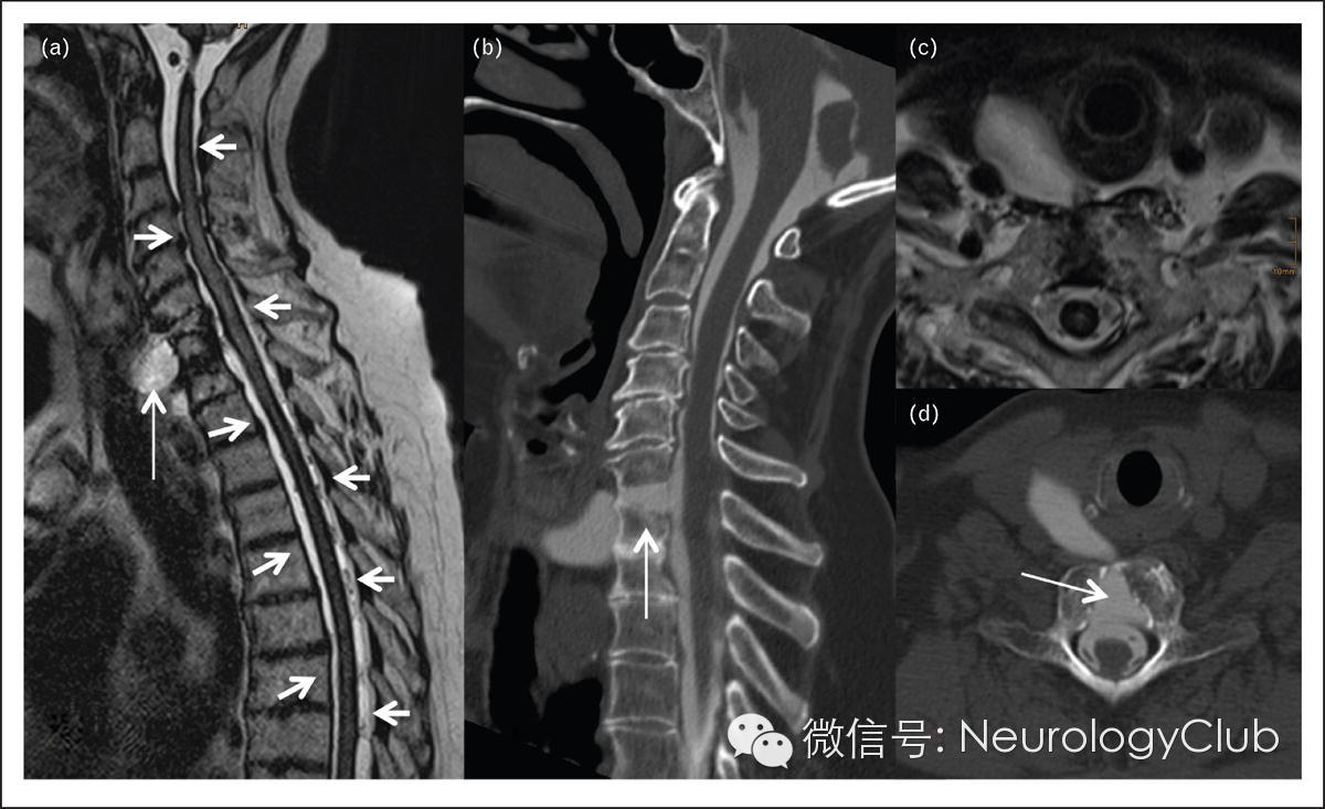 54岁女性,诉体位性头痛,共济失调,认知功能下降。矢状位(图a)和轴位(图c)T2快速自旋回波图像提示脊髓表面有含铁血黄素沉着(短箭,图a,c),并发现C7椎体的右前外侧方有一个充满液体的结构(箭,图a)。CT脊髓造影(箭,图b,d)显示蛛网膜下腔和椎前囊有广泛的交通。20年前患者曾行C6/C7椎体融合术。大多数材料已被吸收,残存的材料在交通区的边缘仍然可见。