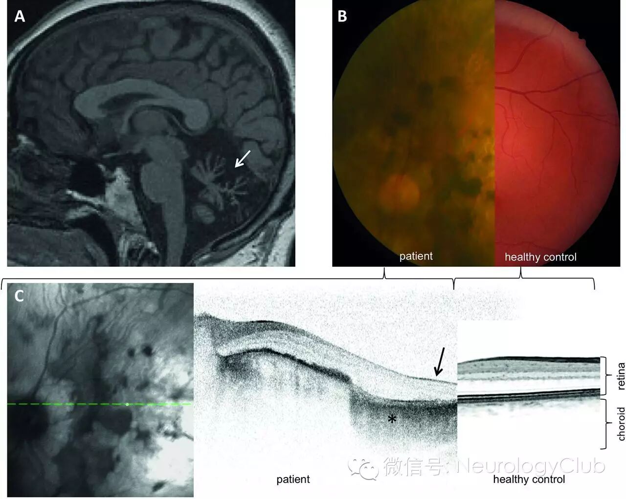(图1:MRI,眼底镜和光学相干断层扫描[OCT]。MRI提示明显的小脑萎缩[A];眼底镜检查可见视网膜退行性变伴色素沉积[B左];OCT[绿线指红外线眼底照相部位,C左])证实与对照组相比[C右]视网膜变薄[箭]和脉络膜血管萎缩[*])