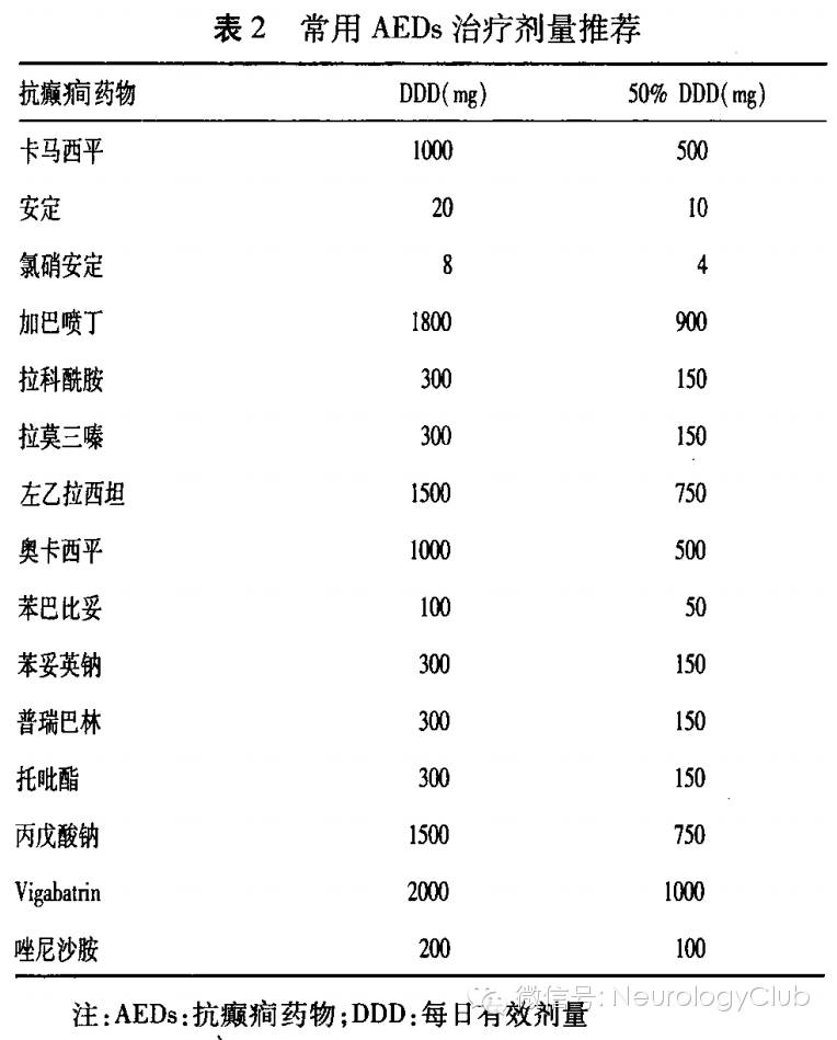 1.2 合理的治疗剂量 来自全球各癫痫治疗中心的数据显示,不同的临床研究中心,不同的国家关于不同药物的有效剂量均不相同,并且患者的体质量、体表面积、胃肠道吸收功能、年龄、肝肾功能以及药物之间的相互作用等均可能影响药物的有效浓度。新近关于治疗剂量研究发现,如果患者的第一个药物治疗剂量>50%药物每日有效剂量(WHO defined daily dose,DDD),相对于第一个药物治疗剂量<50%DDD患者,其最终预后明显下降(P<0.001)。为了使药物有效浓度的判断标准客观统一,且具有可操作性,结合ILAE专家共识的推荐及其发表以后关于治疗剂量的探讨,推荐治疗剂量的最低标准为50%DDD。常见AEDs治疗剂量推荐参见表2。部分患者小剂量AEDs即可获得良好疗效,故对于临床治愈的患者,治疗剂量不受50%DDD要求的约束。