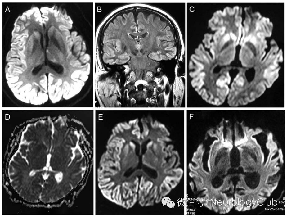 (图:A-B:起病3月时的DWI和FLAIR可见明显的较为对称的双侧皮层灰质受累;C-D:起病5月时皮层下灰质(尾状核)及皮层灰质病灶DWI呈高信号,ADC呈低信号;E:螯合治疗后DWI上病灶无明显改善;F:2年随访时可见脑萎缩)