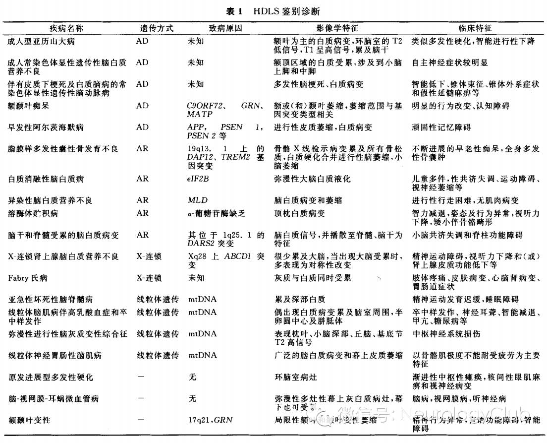 HDLS需要和其他疾病鉴别(表1),目前确诊方法主要是基因检测,或病理学证实,临床常用的辅助检查包括血液生化、脑脊液等对鉴别诊断价值不高。