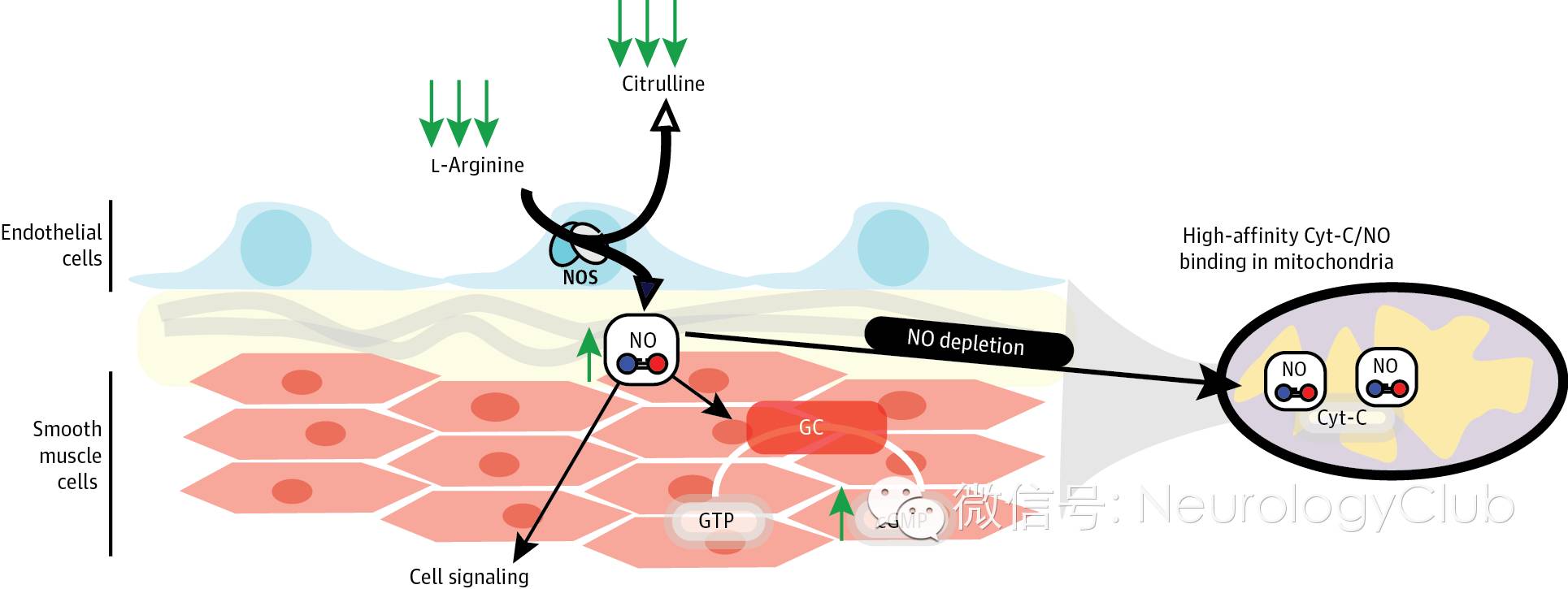 (内皮依赖性血管舒张功能由一氧化氮合成酶介导[NOS],后者将L-精氨酸转换成一氧化氮[NO]。NO结合可溶性鸟苷酸环化酶[sGC],将三磷酸鸟苷[GTP]转换成环单磷酸鸟苷[cGMP],使得平滑肌细胞舒张和血管扩张。Cyt-C:细胞色素C)