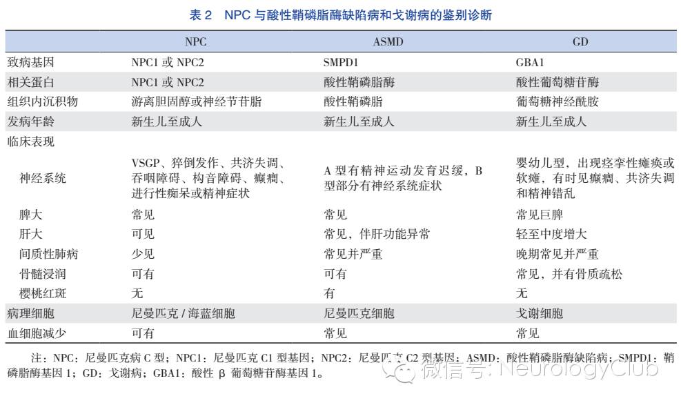NPC的鉴别诊断主要是酸性鞘磷脂酶缺陷病、戈谢病等其他脂质沉积性疾病(表2)、先天性新生儿肝炎和其他原因引起的新生儿胆汁淤积性黄疸,较大的儿童还要与其他原因引起的小脑性共济失调、肌张力障碍、猝倒、核上性眼肌麻痹相鉴别。青少年与成人发病多表现为精神症状和认知损害,要与阿尔兹海默病、额颞痴呆和精神分裂症区别。