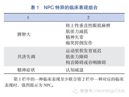VSGP是NPC特征性表现之一,如再合并脾肿大或共济失调要高度怀疑本病,痴笑猝倒发作是NPC另一个特异性表 现, 虽较VSGP少见,但若合并有脾肿大等其他表现时,也强烈提示为NPC。新生儿期出现难以解释的并持续存在的胆汁淤积性黄疸时应考虑到NPC,婴幼儿出现发育迟滞是非特异性症状,如果运动里程发育落后、精细动作不协调,合并脾脏肿大或快速眼动异常,是早期诊断NPC的指征,但是没有脾脏肿大也不能除外NPC。