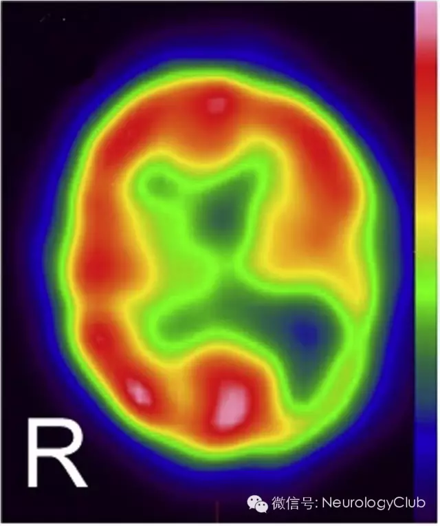 MRI黑水像(图1A)可见双侧顶枕区不对称的异常高信号。相应的DWI(图1B)上可见病灶弥散受限,而ADC呈低信号(图未放),提示右侧顶枕区急性梗死,而左侧顶枕区应为先前梗死病灶。锝-99m SPECT灌注扫描可见左侧顶枕区灌注缺损(图2)。