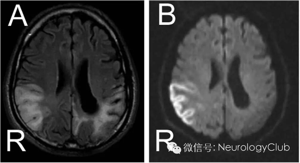 (图1:A:FLAIR;B:DWI)