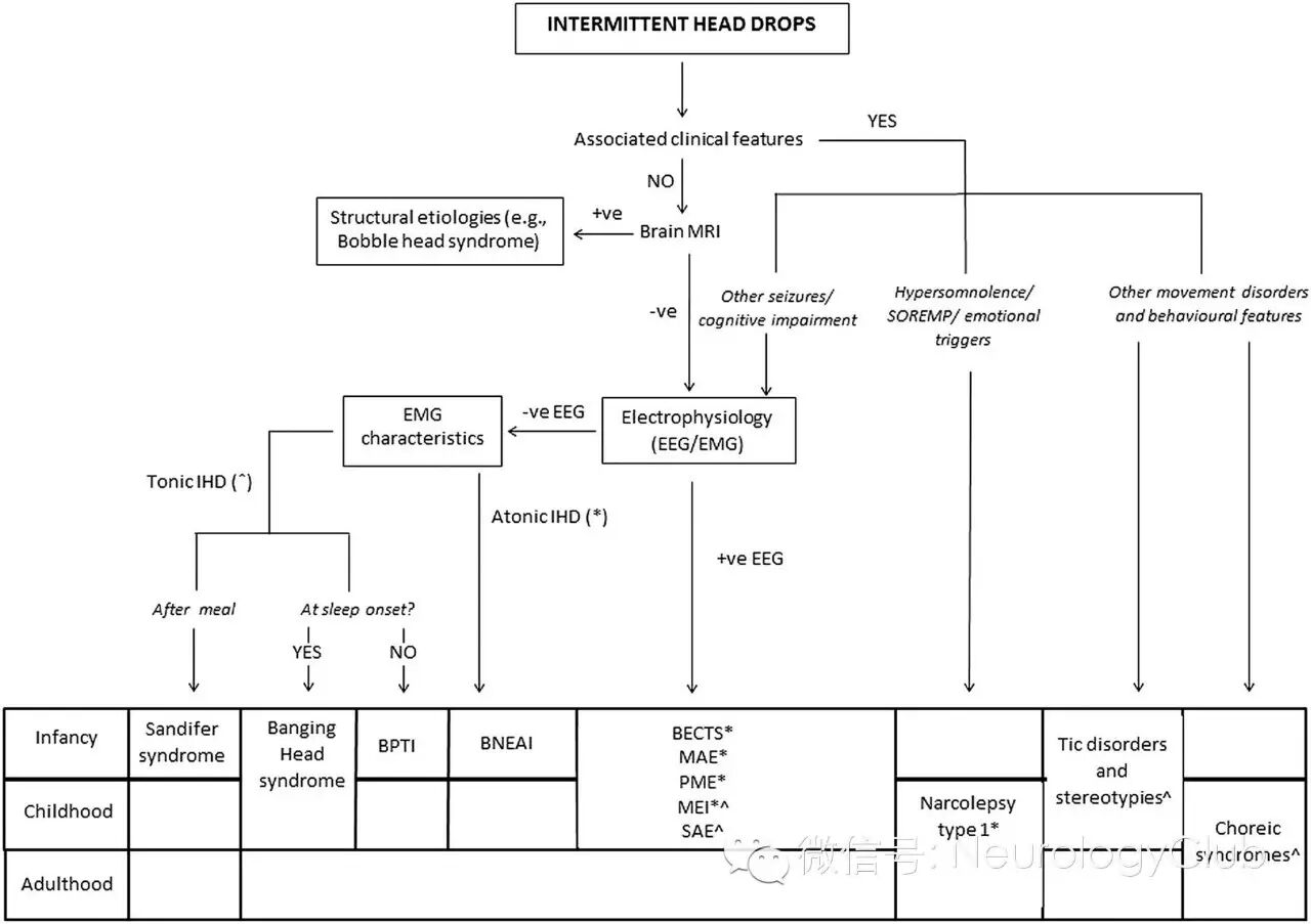 间歇性垂头(Intermittent Head Drops,IHDs)指反复突然发作的头部前屈,一天中可规律或不规律出现一次或多次,这种情形可见于多数疾病,如癫痫,抽动障碍与刻板动作,舞蹈综合征(如舞蹈病-棘红细胞增多症,亨廷顿病等),发作性运动障碍,婴儿良性阵发性斜颈,点头娃娃综合征(Bobble-head doll syndrome),睡眠相关的节律性运动障碍,发作性睡病1型(既往称为猝倒型发作性睡病),点头综合征(nodding syndrome),Sandifer综合征等,有些患者病因不明。