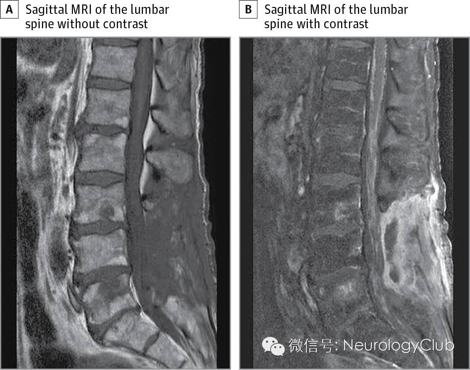 69岁白人,主诉进行性双下肢无力,左面部无力和复视2月,6月内体重下降20.4kg,新近出现尿失禁。2月前,患者因症状性椎管狭窄行L3-S1腰椎板切除术。即便如此,患者下肢无力逐渐加重。否认头痛,发热,咳嗽,无免疫缺陷的危险因素,也未到其他地方旅游。