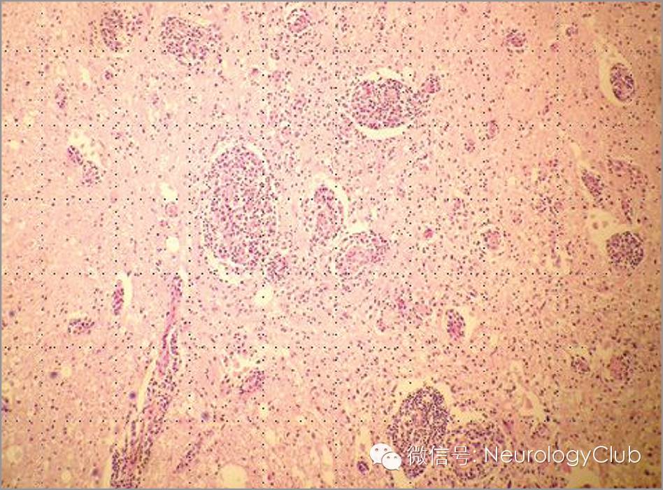 患者神经系统症状进行性恶化,不久后去世。起病3月后的尸检提示为非霍奇金弥漫大B细胞淋巴瘤伴突出的软脑(脊)膜受累。病理学HE染色证实原发性中枢神经系统淋巴瘤伴典型的血管中心性淋巴细胞聚集特征,免疫组化进一步证实了这一诊断(图2)。