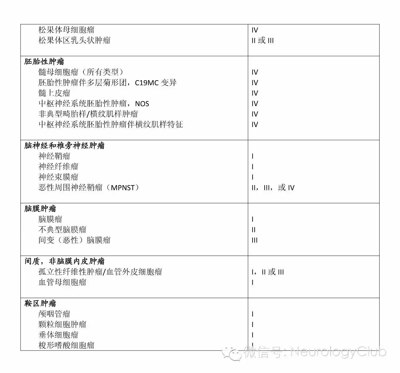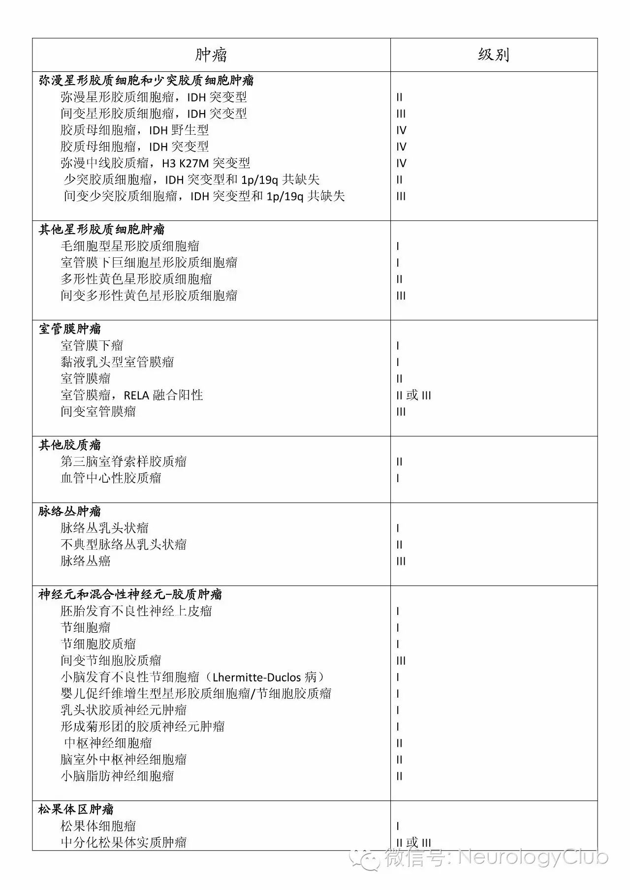 I级病变通常包括增生潜能低和单独外科手术能够治愈的肿瘤;II级病变通常具有浸润的特性,尽管只有较低水平的增生能力,但经常复发,也可出现间变;III级病变具有组织病理学恶性表现,包括核异型性和活跃的核分裂,多数情况下,手术后应接受放疗和化疗;IV级病变具有细胞学恶性表现,核分裂活跃,具有坏死倾向,手术前后发展速度很快,某些IV级肿瘤还可有周围组织的广泛浸润以及脑脊髓播散。