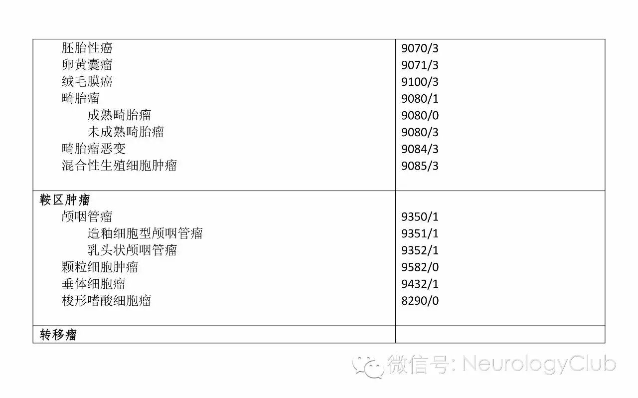 中枢神经系统肿瘤分类按照国际疾病肿瘤学分类法(ICD-O)进行,可同时反应解剖部位,形态学和生物学行为。临床医生最需要了解的肿瘤生物学行为在“/”后一个编码:0代表良性;1代表生物学行为未定,未知或交界性;2代表原位癌或III级上皮内瘤变;3代表恶性肿瘤。