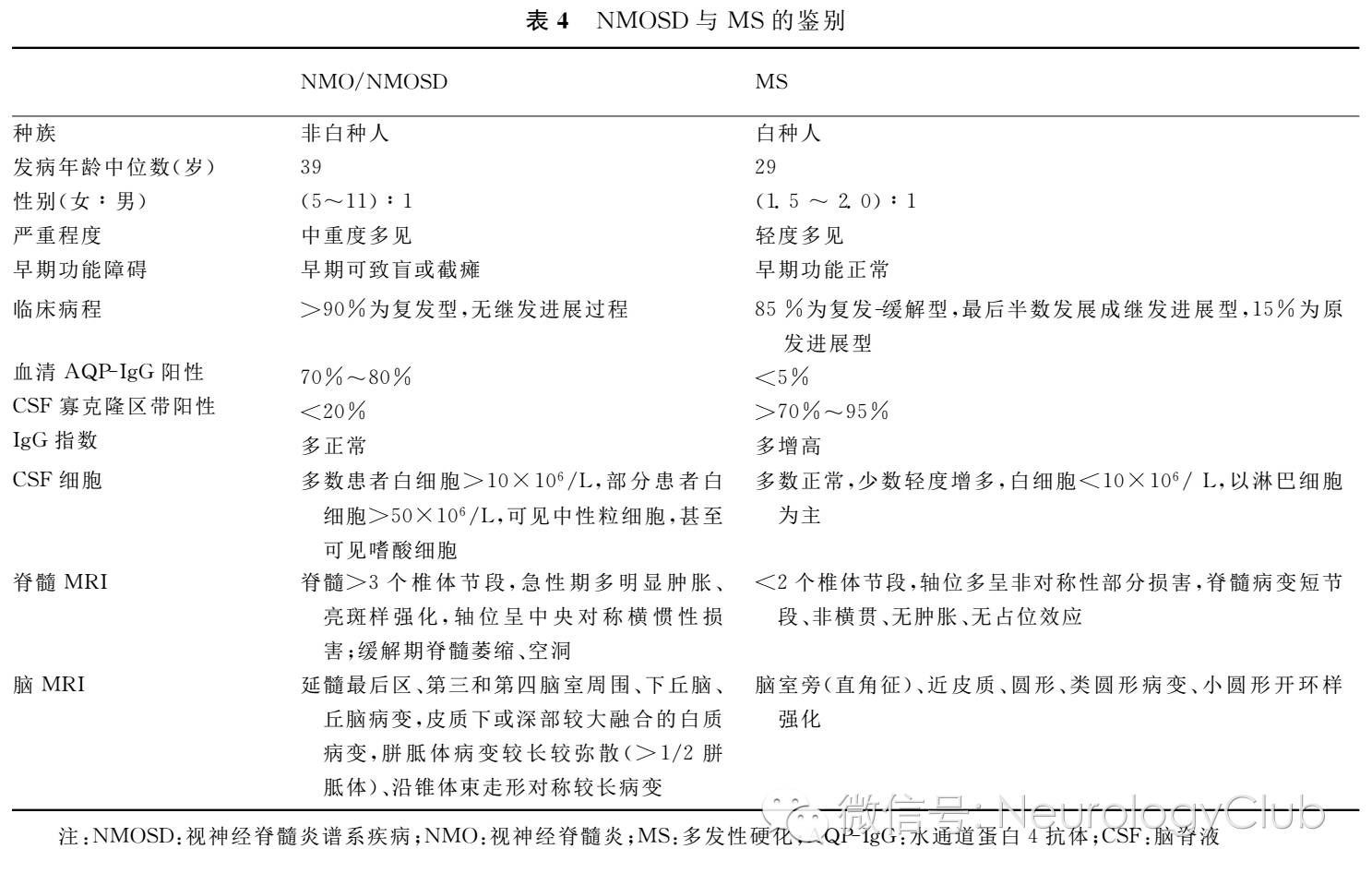4.2 相关鉴别疾病 主要包括:(1)其他炎性脱髓鞘病:MS(表4)、急性播散性脑脊髓炎、假瘤型脱髓鞘等;(2)系统性疾病:系统性红斑狼疮、白塞病、干燥综合征、结节病、系统性血管炎等。(3)血管性疾病:缺血性视神经病、脊髓硬脊膜动静脉瘘、脊髓血管畸形、亚急性坏死性脊髓病等;(4)感染性疾病:结核、艾滋病、梅毒、布氏杆菌感染、热带痉挛性截瘫等;(5)代谢中毒性疾病:中毒性视神经病、亚急性联合变性、肝性脊髓病、Wernick脑病、缺血缺氧性脑病等;(6)遗传性疾病:Leber视神经病、遗传性痉挛性截瘫、肾上腺脑白质营养不良等;(7)肿瘤及副肿瘤相关疾病:脊髓胶质瘤、室管膜瘤、脊髓副肿瘤综合征等;(8)其他:颅底畸形、脊髓压迫症等。