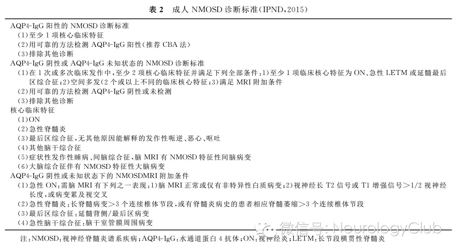 3.2 2015年国际NMO诊断小组(IPND)制定的NMOSD诊断标准 见表2。新的标准将NMO纳入NMOSD统一命名,以AQP4-IgG作为分层,分为AQP4-IgG阳性与阴性组,列举了6大临床特征性表现,其中ON、急性脊髓炎及延髓最后区综合征最具特征性。强调影像学特征与临床特征的一致性,对AQP4-IgG阴性NMOSD提出了更加严格的MRI附加条件。此外,伴随自身免疫疾病或自身免疫抗体阳性患者,CSF细胞数轻度升高及视神经轴索损害等证据亦提示支持NMOSD诊断,最后强调了除外其他疾病。