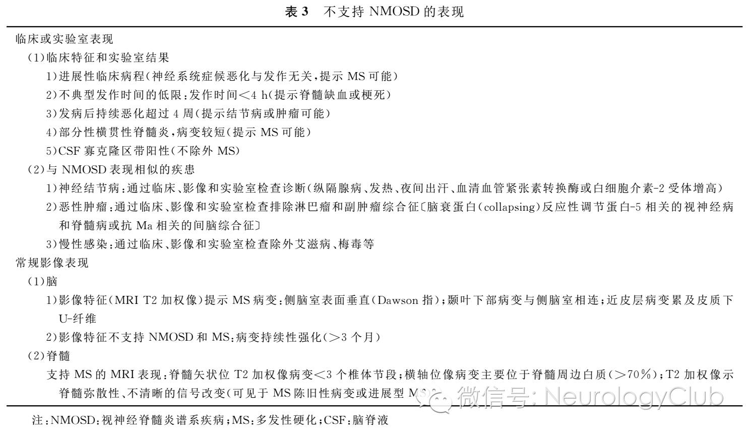 对于早期NMOSD或临床、影像特征表现不典型的病例,应该充分进行实验室及其他相关检查。注意与其他可能疾病相鉴别,并进行动态随访。