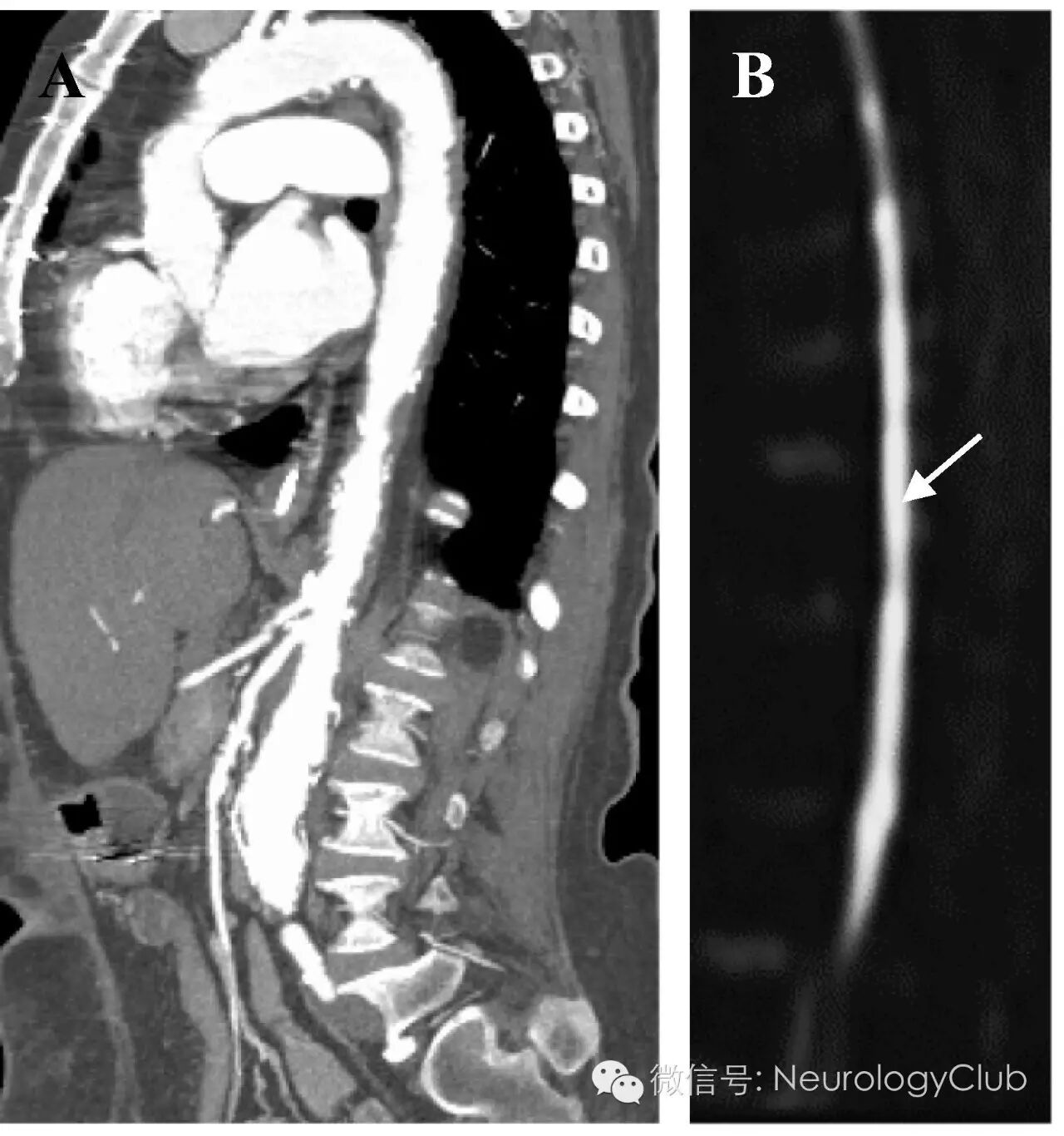 (图2:CT主动脉造影重建[A]和脊髓DWI[B],可见弥漫动脉粥样硬化贯穿主动脉及其主要分支,胸髓和腰髓病灶弥散受限[箭])