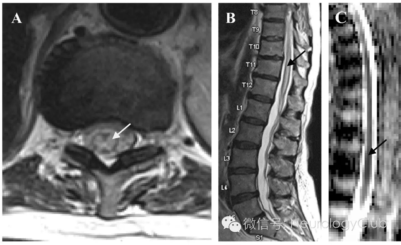 (图1:横断面[A]和矢状位[B]T2WI以及矢状位ADC[C]可见脊髓病灶[箭])