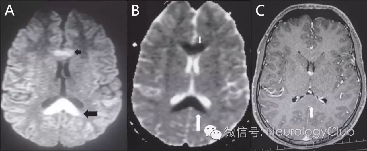 (图9:立克次体感染相关的RESLES。A:DWI;B:ADC;C:T1增强;可见SCC“回旋镖征”及胼胝体膝部病灶)