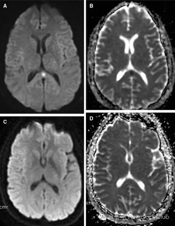 (图1:抗VGKC抗体相关的RESLES。起病7天后MRI上可见SCC病灶,22天后病灶消失。A与C:DWI;B与D:ADC)