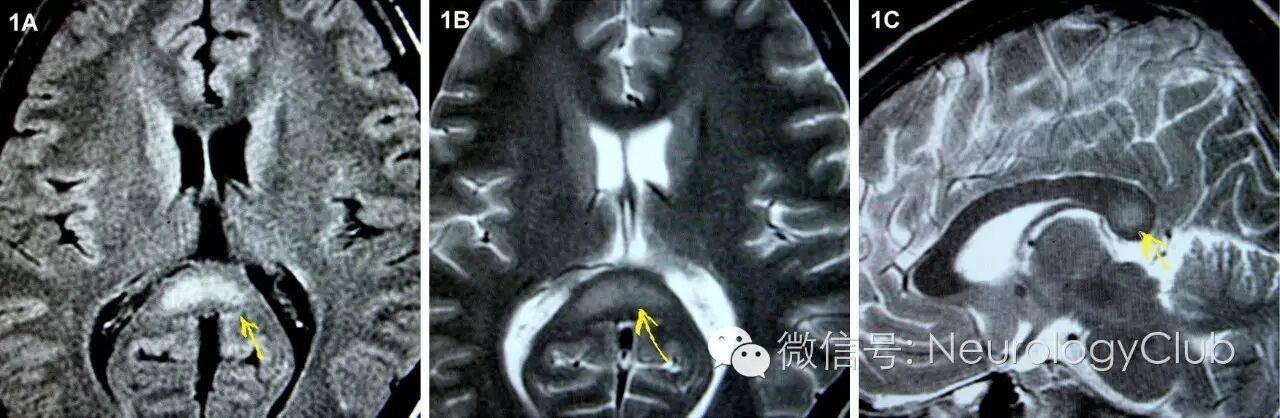 (图6:钩端螺旋体感染相关的RESLES。A:FLAIR;B-C:T2WI;可见半月形SCC高信号病灶,称“小回旋镖征”)