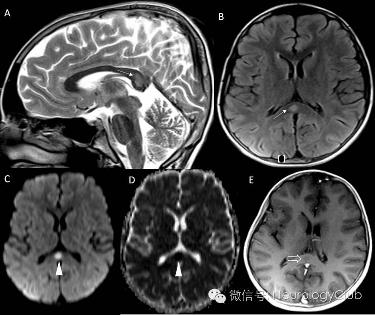 目前尚无RESLES引起胼胝体离断综合征的报道。后者多见于累及胼胝体前部的大范围损伤。