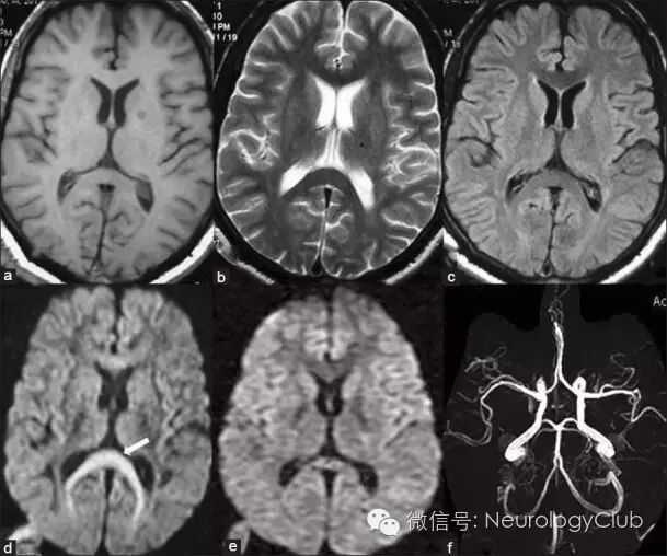 (图5:癫痫发作相关的RESLES。a:T1WI;b:T2WI;c:FLAIR;a-c未见SCC异常信号;d:DWI可见“回旋镖征”;e:DWI,6月后复查病灶消失;f:MRA无殊)