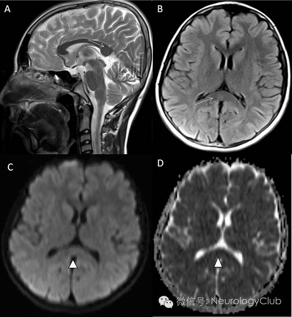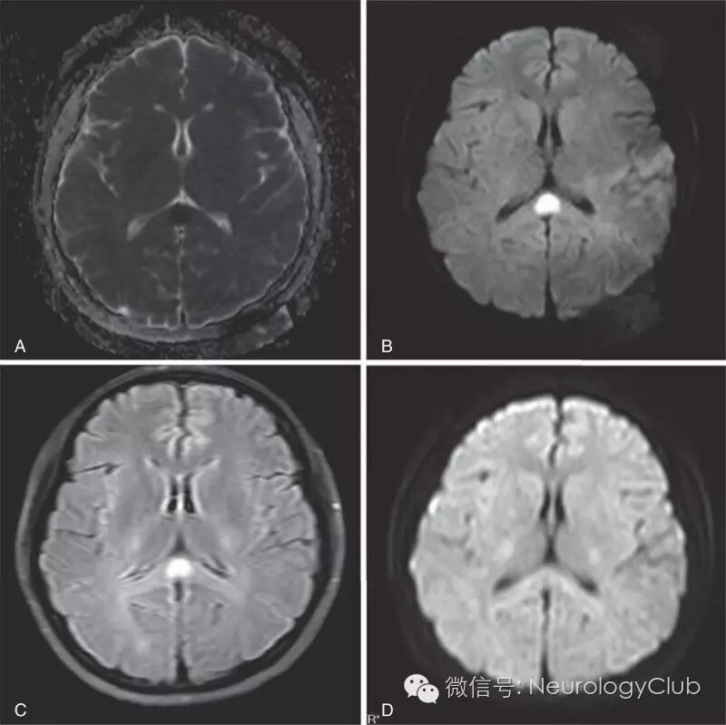 (图2:腮腺炎病毒感染相关的RESLES。起病时的MRI上可见SCC病灶[A-C依次为ADC,DWI和FLAIR],2周后复查病灶消失[D,DWI])