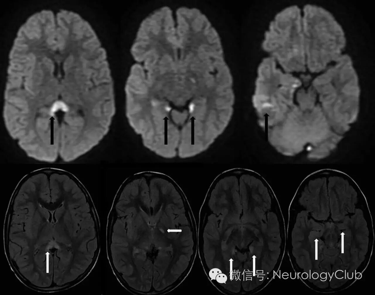 (图8:立克次体感染相关的RESLES。上:DWI;下:FLAIR;可见SCC“回旋镖征”以及其他部位病灶;10天后复查异常信号消失)