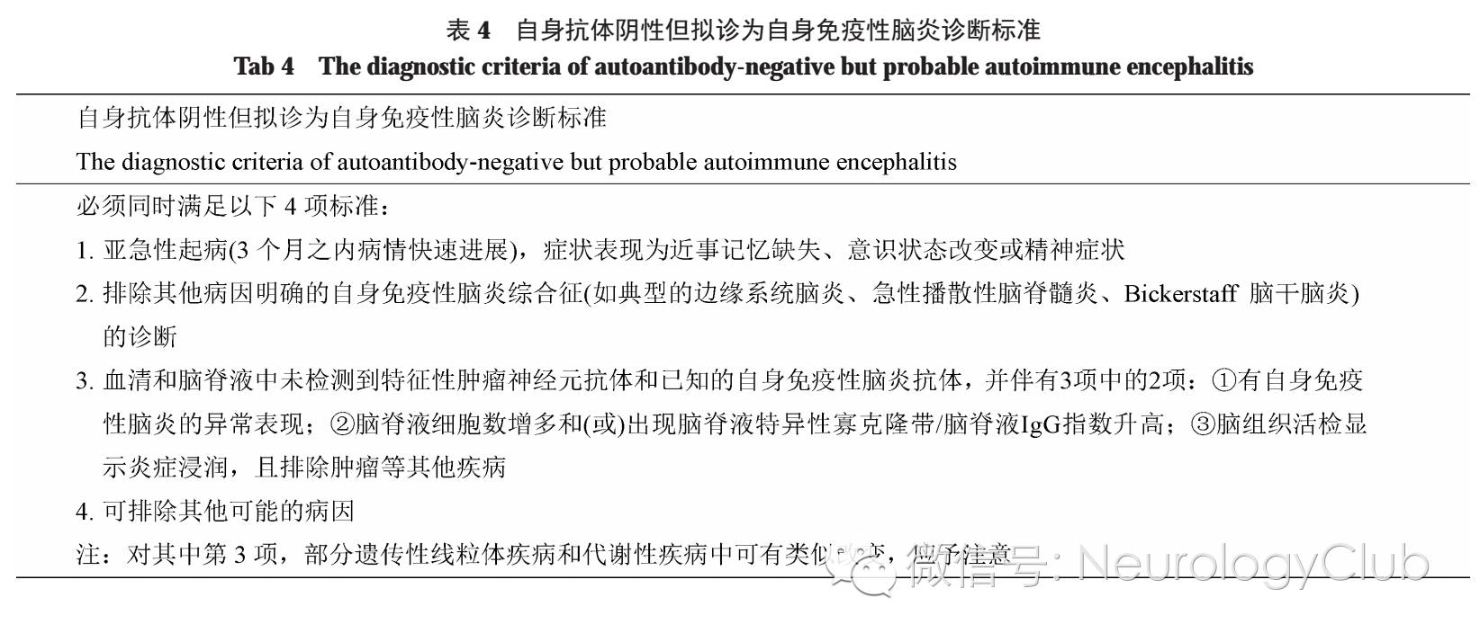 自身抗体阴性的自身免疫性脑炎 临床上存在符合“可能的自身免疫性脑炎”诊断标准的病例,是针对采用基于转染细胞免疫荧光法 (cell-based assay,CBA) 检测自身抗体为阴性的情况。对于这类情况而言,自身免疫脑炎临床诊断标准及排除标准提出“自身抗体阴性但拟诊为自身免疫性脑炎”的诊断标准,见表4。可能的自身免疫性脑炎与自身抗体阴性的拟诊为自身免疫性脑炎的区别在于:①两者诊断级别不一样,后者属于拟诊级别,需要掌握更严格的支持和排除证据后方可诊断;②前者是在抗体检测尚未进行时即可作出的诊断,而后者必须在已知自身抗体检测结果阴性的情况下诊断;③后者还需排除其他容易与之混淆的自身免疫性脑炎综合征。