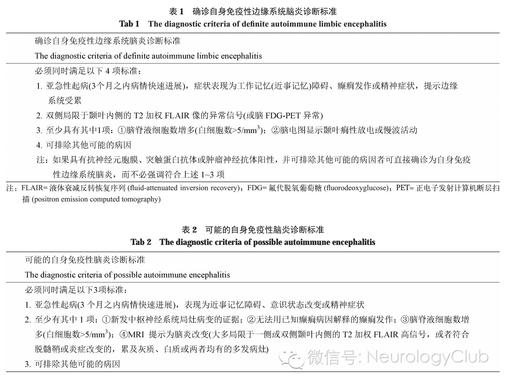 自身免疫性边缘系统脑炎和临床可能的自身免疫性脑炎 该自身免疫性脑炎临床标准及排除标准提出自身免疫性脑炎的诊断可分为3级:可能(possible)、拟诊(probable) 和确诊(definite),前两者不依赖于自身抗体检测结果,而确诊一般需要抗体检测为阳性。每一级别诊断都需要若干证据支持点和排除点。确诊自身免疫性边缘系统脑炎和可能的自身免疫性脑炎的诊断标准分别见表1,2。