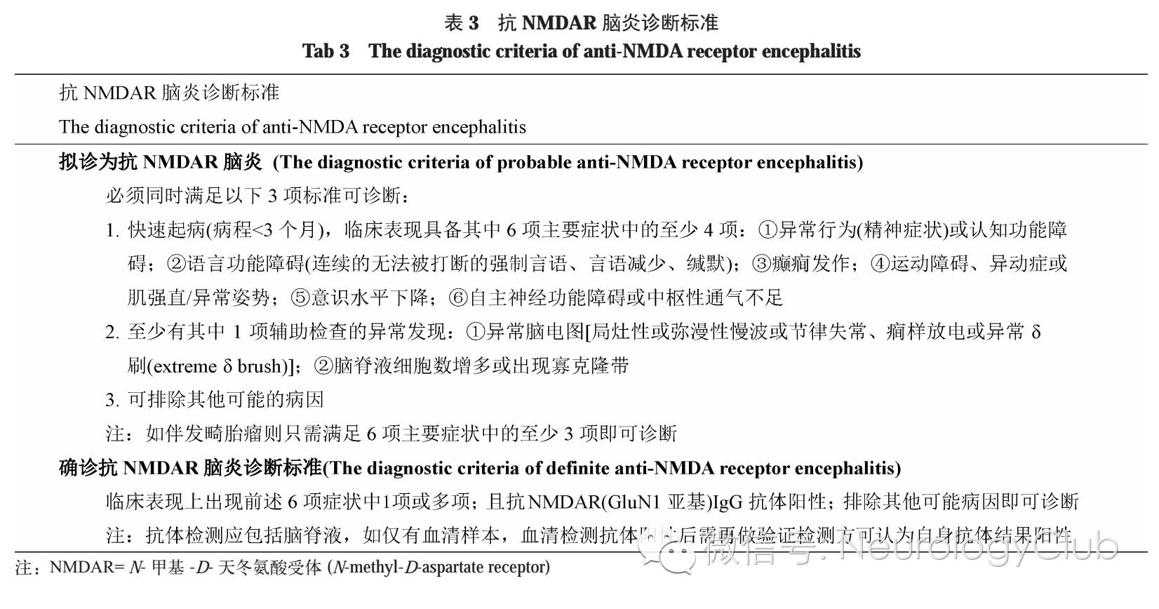 抗NMDAR脑炎 抗NMDAR脑炎的诊断标准分为拟诊和确诊两个级别(表3)。其诊断是基于该病特有的症状群、辅助检查及自身抗体检测和肿瘤证据的支持。抗NMDAR脑炎被单独列为独立的诊断而未纳入自身免疫性边缘系统脑炎的可能原因有:①抗NMDAR 脑炎有着除边缘系统脑炎典型临床表现以外的其他较为特征性的表现,如口面部的不自主运动、言语障碍、自主神经功能障碍和中枢性通气不足;②尽管无法确切统计各种类型自身免疫性脑炎的发病率,但从目前资料看抗 NMDAR 脑炎病例数远高于其他类型自身免疫性脑炎;③抗NMDAR脑炎与畸胎瘤存在明确的关联性;④抗NMDAR脑炎的MRI表现往往为皮质或皮质下非特异性信号异常,且阳性率低,而双侧边缘系统受累的影像学证据则是临床确诊自身免疫性边缘系统脑炎的必要条件。综上原因,抗NMDAR脑炎目前采用独立于自身免疫性边缘系统脑炎的疾病诊断标准。值得注意的是,抗NMDAR脑炎的诊断标准中并未将近事记忆障碍列入临床主征,这是因为对于那些存在精神症状或儿童病例难以评估记忆障碍。但作为该病较为常见的症状,记忆障碍往往可通过询问病史获得。因此可考虑把近事记忆障碍纳入诊断标准,但需积累进一步的临床证据。