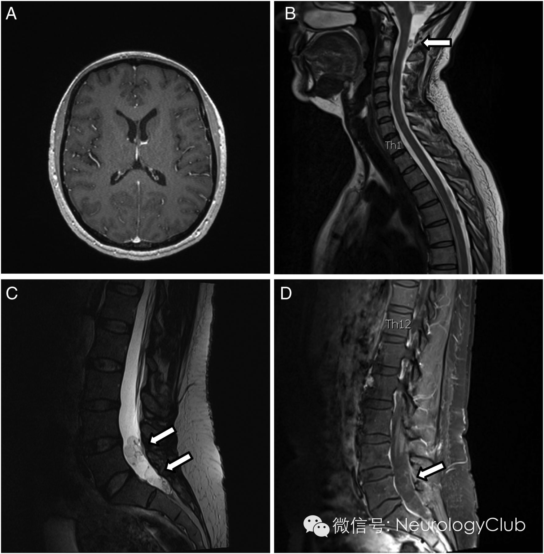 脊髓MRI见颈椎部蛛网膜下腔处有一囊性病灶,腰椎部蛛网膜下腔多发囊性病灶。增强病灶呈环形强化。