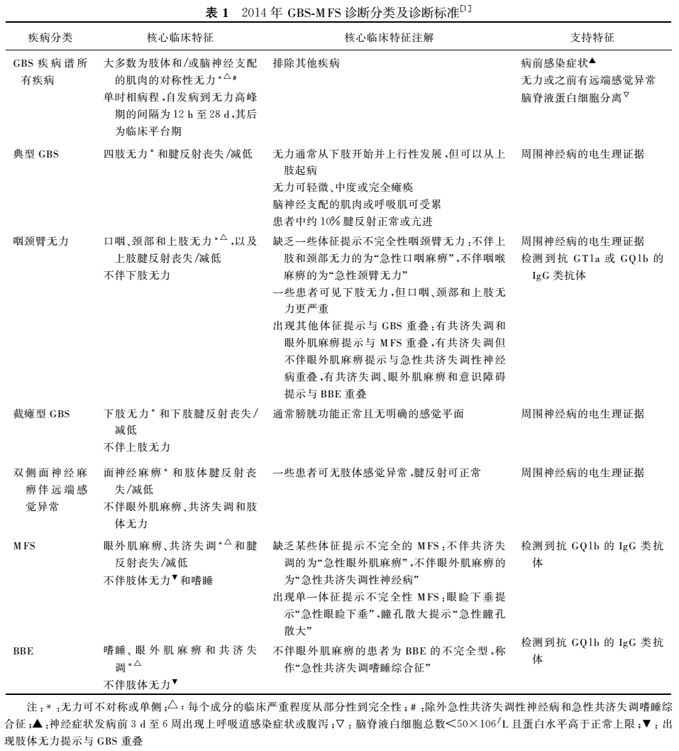 2011年国际疫苗安全性监测Brighton合作组将双侧肢体软瘫、无力的肢体腱反射减低或丧失、单时相病程(发病后12h至28d达到高峰期)以及排除其他引起无力的疾病作为GBS定义的临床核心特征,在脑脊液蛋白-细胞分离和电生理改变符合GBS均具备的情况下确诊GBS,具备其一为很可能,只有核心特征为可能。将双侧眼外肌麻痹及双侧腱反射减低或丧失及共济失调、不伴肢体无力、无意识障碍或锥体束征、 单时相病程以及排除其他疾病作为MFS的核心特征,在脑脊液蛋白-细胞分离和神经传导检查正常或仅累及感觉神经均具备的情况下确诊MFS,具备其一为很可能,只有核心特征为可能。这两个标准仍然只列出了GBS和MFS的典型表现,使不典型、不完全受累但又有证据(脑脊液蛋白-细胞分离、特定抗神经节苷脂抗体或电生理证据)支持属于GBS病谱者无法诊断,而此次GBS和MFS新分类及其诊断标准的提出成功解决了这些问题。