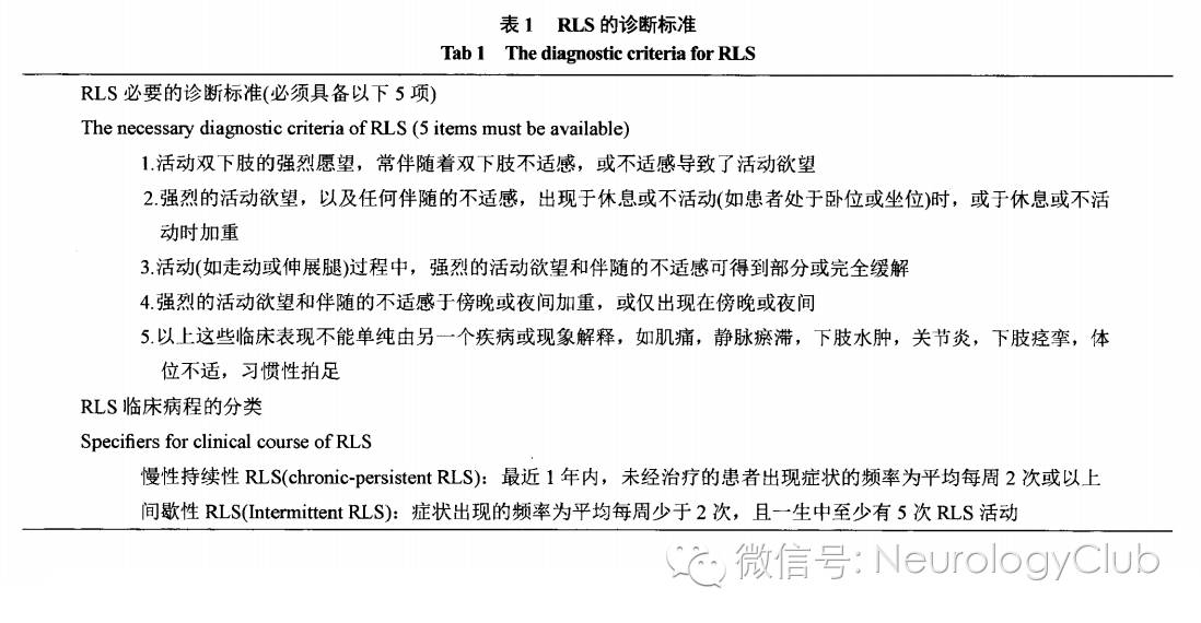 不安腿综合征(restless legs syndrome,RLS)是一种常见的神经系统感觉运动性疾病,显著影响患者的睡眠及生活质量。1685年Thomas Willis第一次描述了RLS,但直至1945年,Karl-Axel Ekbom才在他的开创性专著“不安腿(Restless Legs)”中提出了诊断标准。为纪念他们,国际上RLS也称为Willis-Ekbom病(WED),即RLS/WED。之后,RLS经历了多次诊断标准的修改,最新的是2014年国际RLS研究小组(the Intemational Restless Legs Syndrome Study Group,IRLSSG)提出的RLS诊断标准共识(表1)。