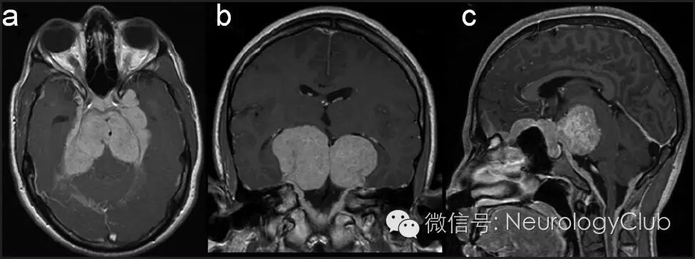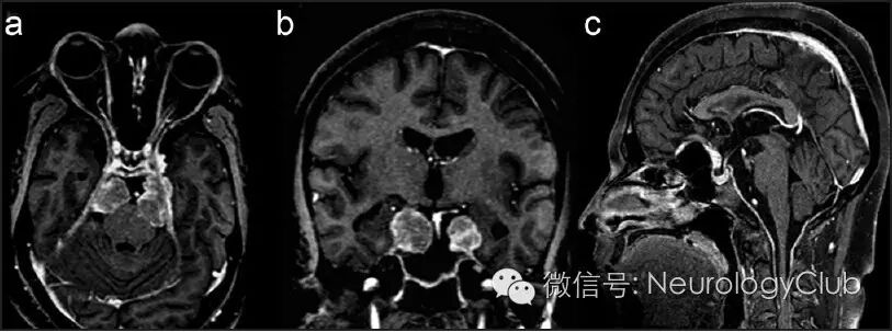 (图1:治疗前的增强MRI。可见双侧强化结节状病灶,位于前、中、后颅窝,伴颈部硬脊膜增厚)