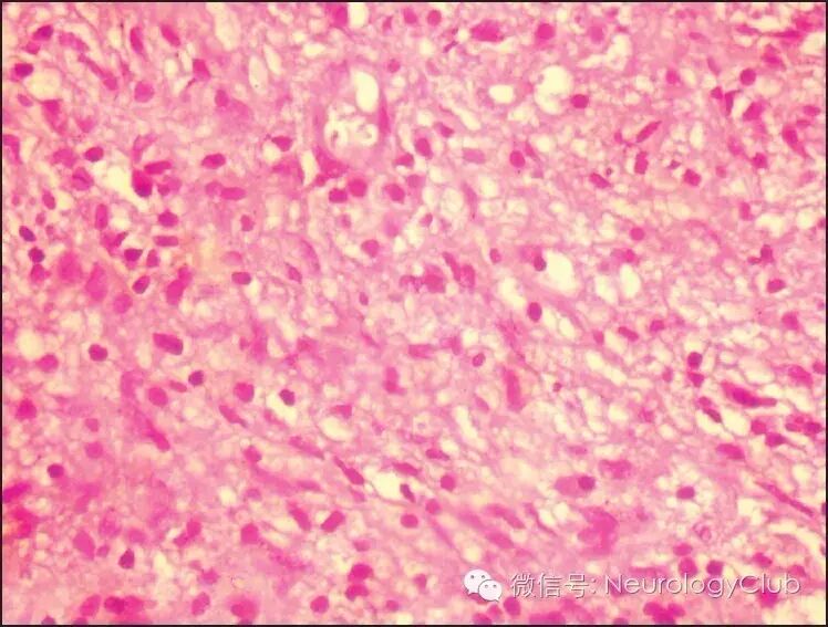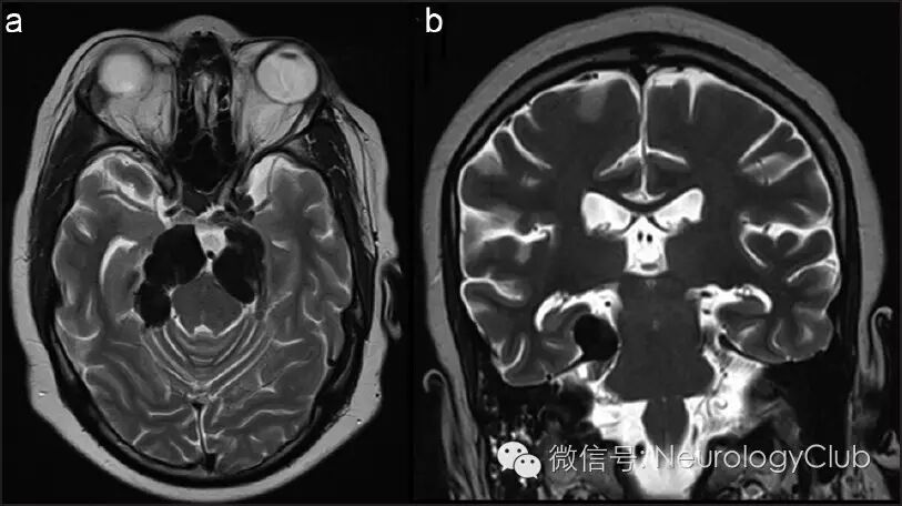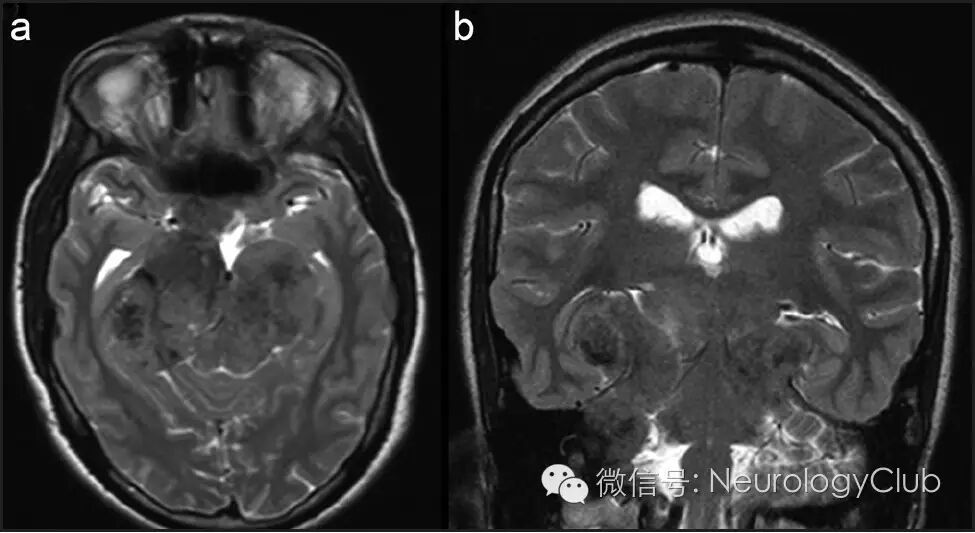 (图2:治疗前的T2WI。可见病灶呈等至低信号,伴有明显的脑干受压)