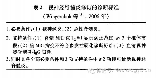 2004年Lennon等在NMO患者血清中发现高度特异性AQP4抗体,从而进一步区分了NMO与MS,确认MS是一种独立的疾病。目前,NMO作为一种特发性、严重的中枢神经系统脱髓鞘性疾病已经得到普遍公认。由于NMO的特异性靶抗原AQP4及其特异性抗体NMO-IgG的发现,以及越来越多的临床研究显示NMO患者早期即可能存在颅内病灶,Wingerchuk等在2006年提出了NMO修订的诊断标准(表2)。