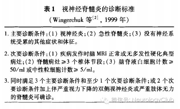 NMO于1894年由Devic提出,又称为Devic病。NMO传统地是指双侧视神经炎与脊髓炎同时或在短期(发作间隔≤1个月)内相继发生的单相型疾病,长期以来被认为是多发性硬化(MS)的临床亚型。1999年Wingerchuk等回顾总结了71例NMO患者的临床资料,根据病程将NMO分为单相型和复发型,大多数病例为单相型病程,少数为复发型,二者的发病年龄、疾病严重程度及预后均有显著差异。Wingerchuk等根据其临床表现,特别是MRI显示的脊髓长节段病变和脑脊液淋巴细胞数改变等特征,重新定义了NMO概念,并首次制定了NMO的诊断标准(表1)。