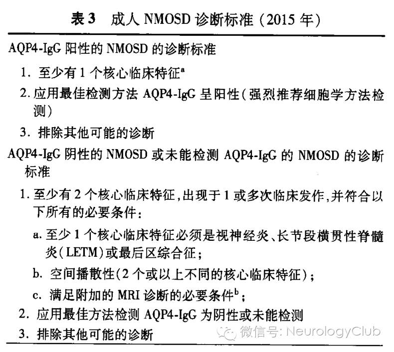 近年来基于2006年NMO修订诊断标准和NMOSD开展的一系列研究发现,NMO和NMOSD患者在疾病的生物学特性和治疗策略方面无显著差异,且绝大部分NMO-IgG阳性的局限型NMOSD患者最终可发展为NMO。因此,国际NMO诊断小组于2015年提出将NMO纳入和统称为NMOSD,并制订相应的诊断标准(表3)。