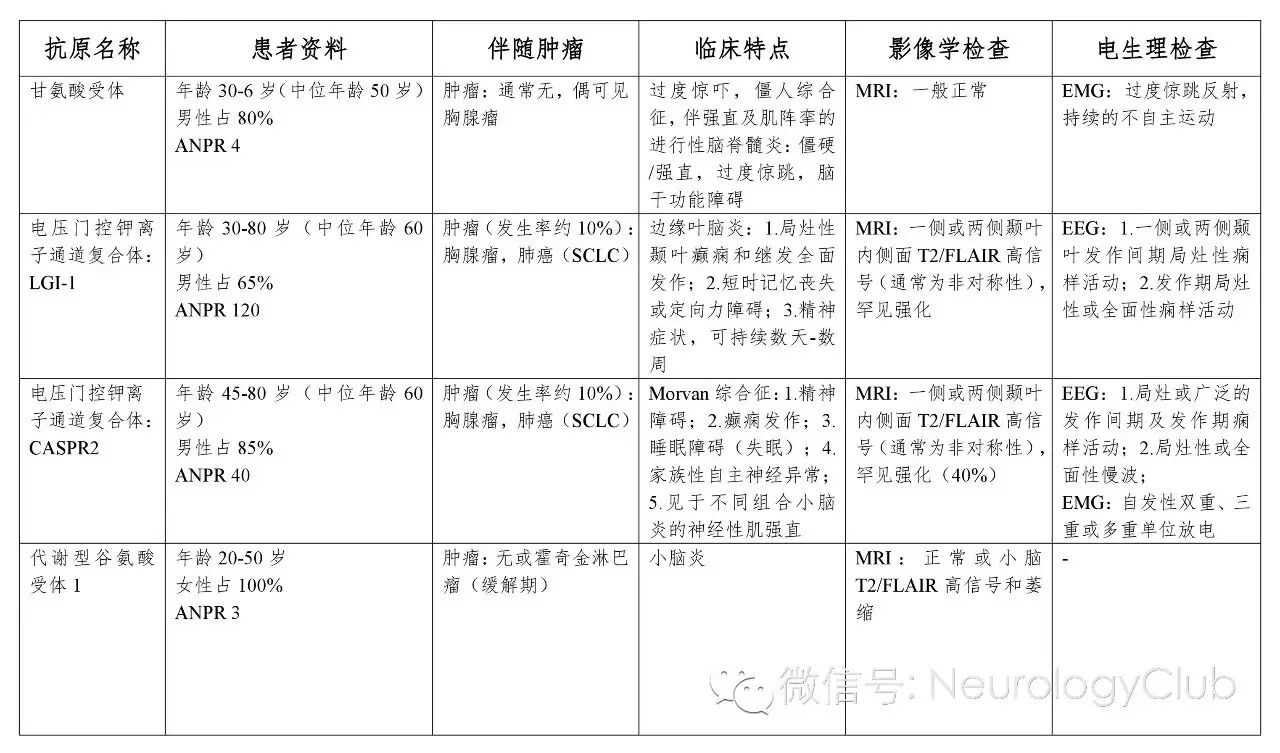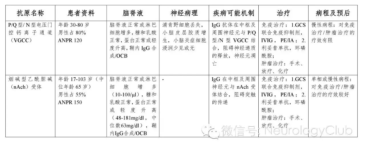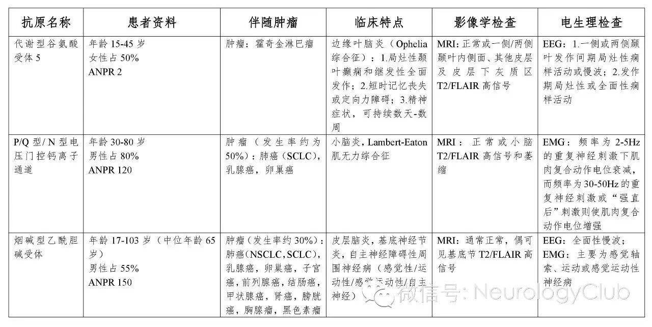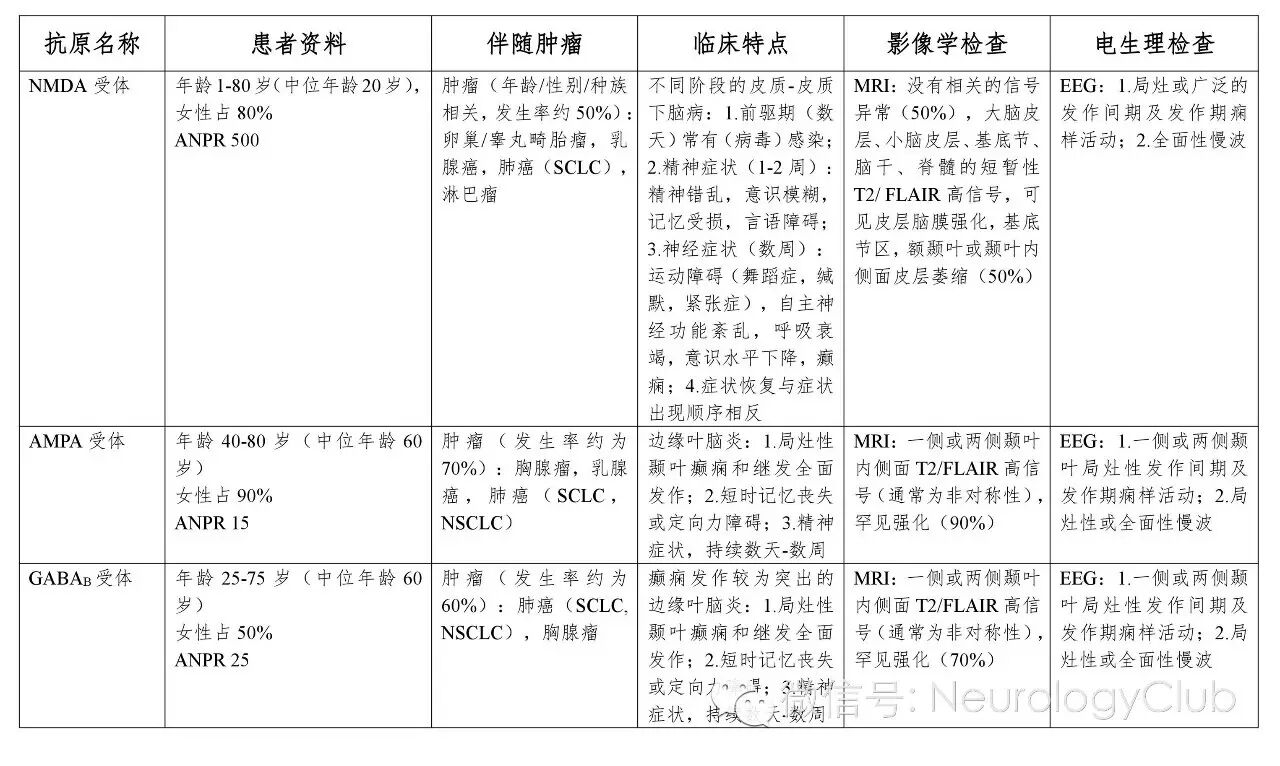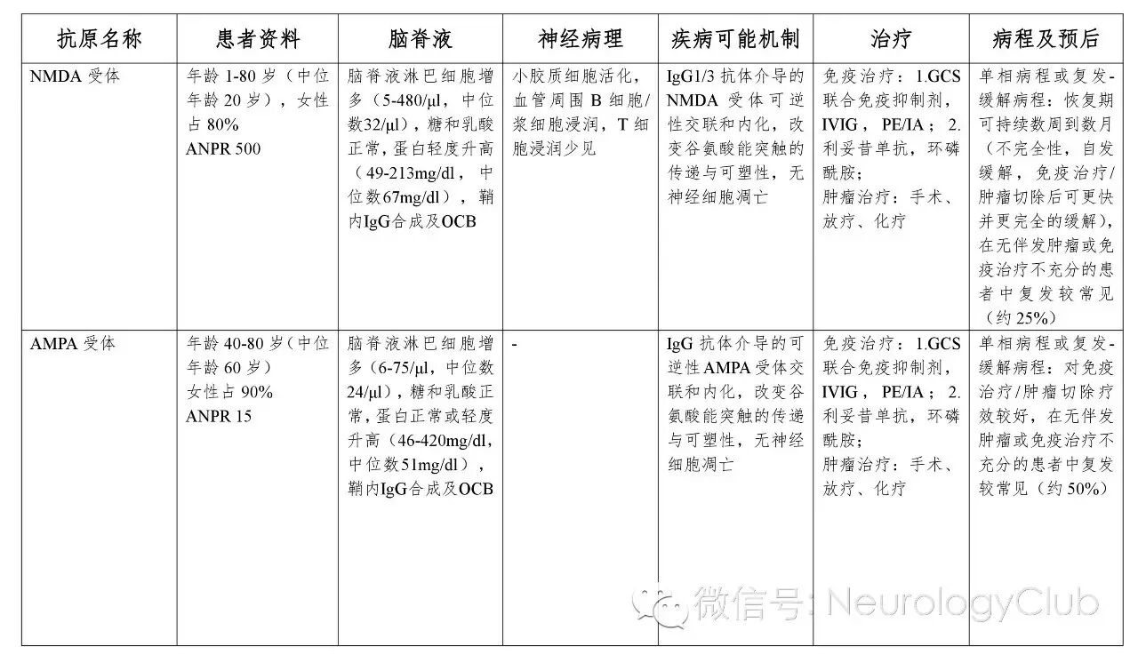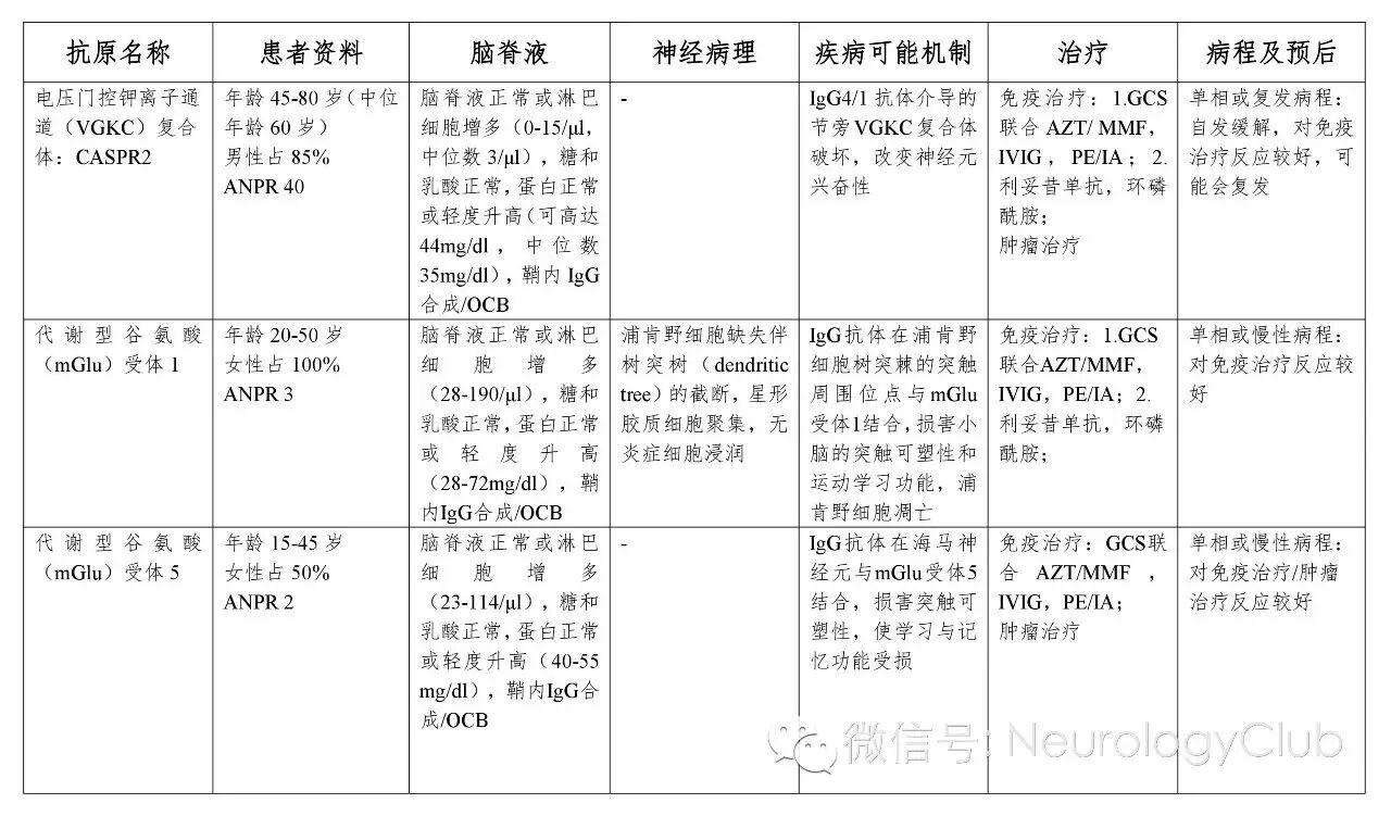 注:SCLC:小细胞肺癌;NSCLC:非小细胞肺癌;ANPR:已报道的大概病例数;OCB:寡克隆带;GCS:糖皮质激素;IVIG:静脉注射丙种球蛋白;PE:血浆置换;IA:免疫吸附;AZT:硫唑嘌呤;MMF:吗替麦考酚酯