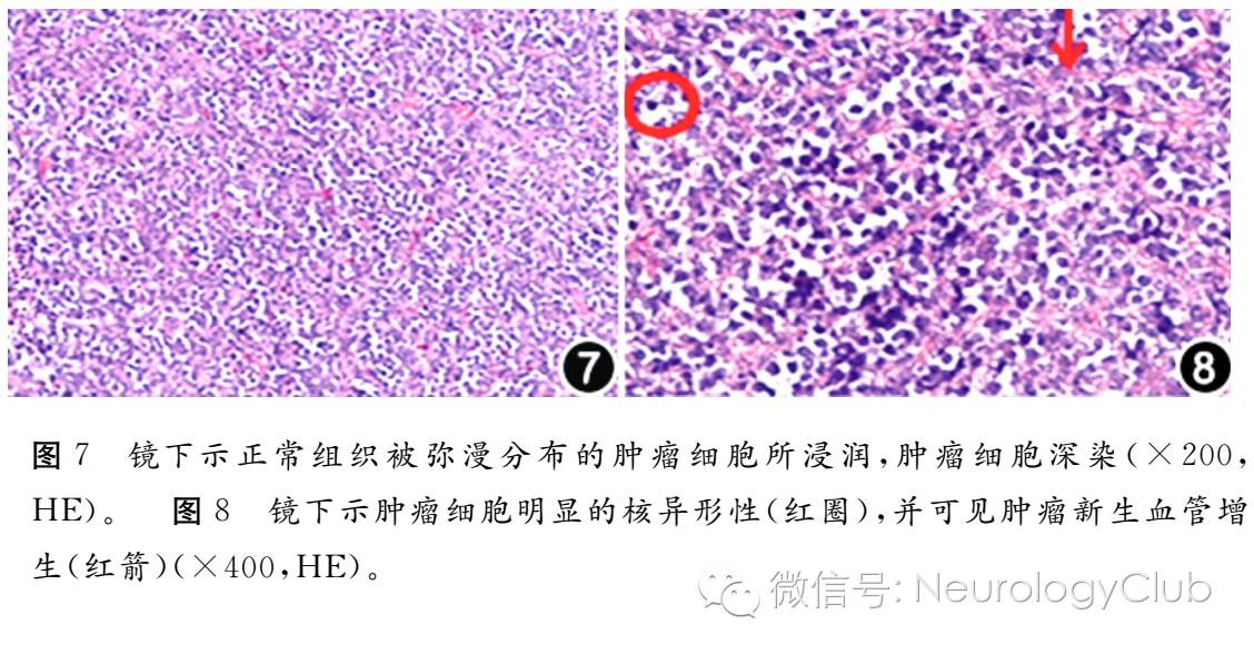 术中所见:切开右侧颞叶,深约5mm即见肿瘤,大小约3.0cm×3.0cm×2.5cm,质地与颅后窝的瘤体相类似,大脑中动脉的分支被肿瘤包绕。右侧桥小脑角区肿瘤色泽苍白,质地脆,大小约3.0cm×3.0cm×3.5cm。边界清楚,瘤体包绕血管,小脑前下动脉、小脑上动脉及岩静脉被包绕;瘤体进入内听道和颈静脉孔。免疫组化标记结果示:瘤细胞CD20(3+),Pax-5(3+),CD3(-),CD43(-) ,CD10(3+),MUM1(3+),Bcl-6(3+),CD34血管(+),GFAP(-),Ki-67 85% (+)。病理结果(图7、8) :右颞叶及右侧桥小脑弥漫大B细胞性淋巴瘤(生发中心型) 。
