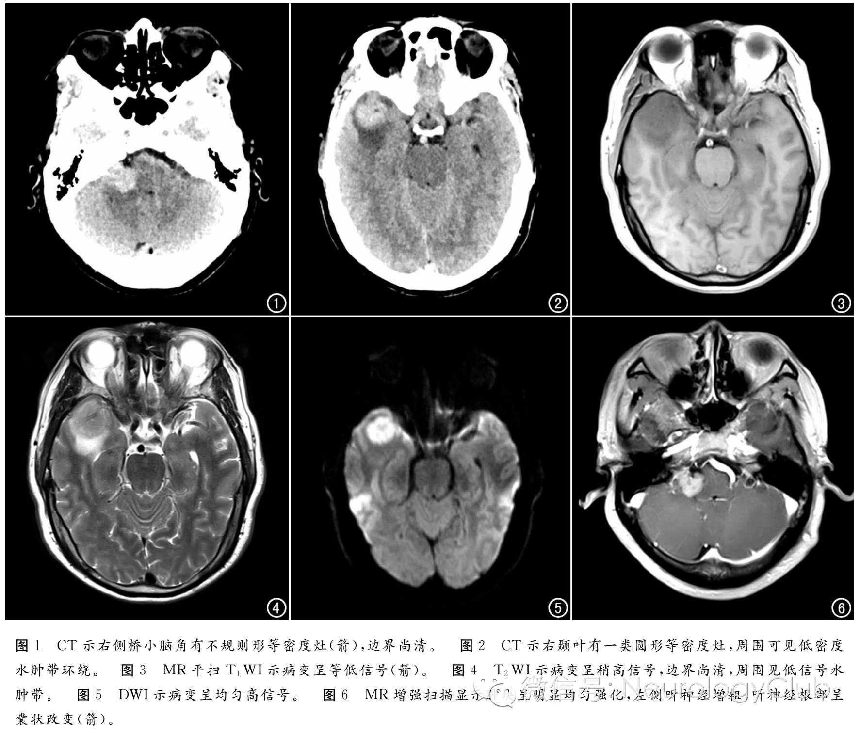 影像学检查:头颅CT示右颞叶、右侧桥小脑角有类圆形等密度病灶,边界尚清,周围可见低密度水肿带环绕(图1、2) 。 头颅MRI示左侧听神经增粗,听神经根部可见囊状改变,增强扫描示双侧听神经明显强化;双侧内听道扩大,右侧桥小脑角区沿听神经根处有一不规则异常信号灶,大小约21mm×18mm,T1WI上呈等低信号灶,T2WI呈稍高信号灶,边界尚清;右外侧裂处可见类似信号的类圆形病灶(图3、4) ,在DWI上呈高信号(图5) ,增强呈明显均匀强化(图6) 。