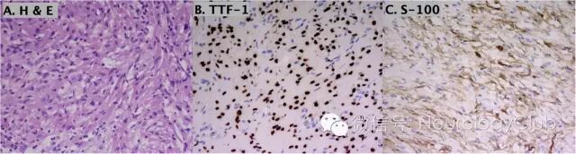 (图3:组织学[×400];A:HE染色;B:甲状腺转录因子-1染色;C:S-100蛋白染色)