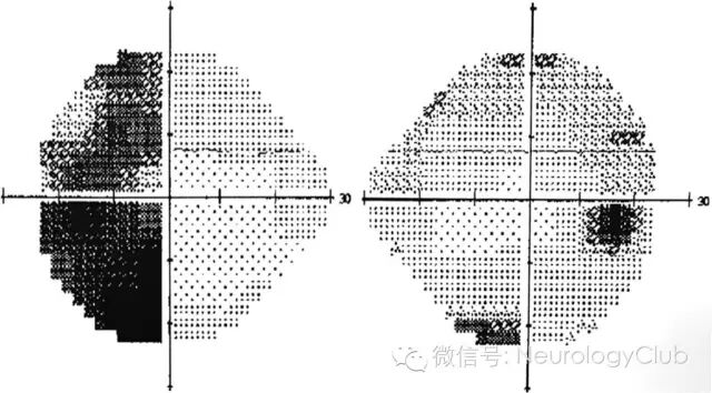 54岁男性,表现为性欲缺失,勃起功能障碍和焦虑3年。患者同时有多尿、夜尿和烦渴数周。既往史无殊。临床查体提示视觉障碍,左侧明显,包括左颞侧偏盲(图1),色觉缺失,颞侧视盘苍白以及右侧视神经增粗。视敏度完好。垂体激素检测提示促性腺激素分泌不足的性腺功能减退,催乳素轻度升高。头颅MRI鞍上病变(图2)。