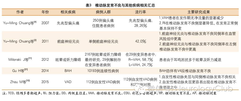 椎动脉发育不良与其他疾病或状态也可能存在关联。在一项有关动脉夹层的椎动脉发育不良病例中报道,受累的椎动脉区域常常位于V1-V2和V3-V4之间的移形区域中,这是由于该区域组织疏松,存在应力及更薄的动脉壁所致。除此之外,椎动脉发育不良也与其他疾病相关,例如:先兆性偏头痛、前庭神经元炎等(表3)。