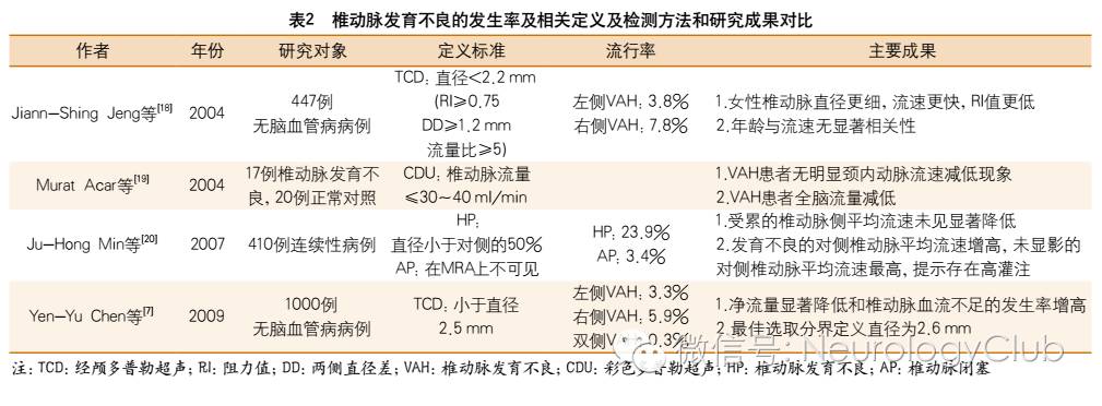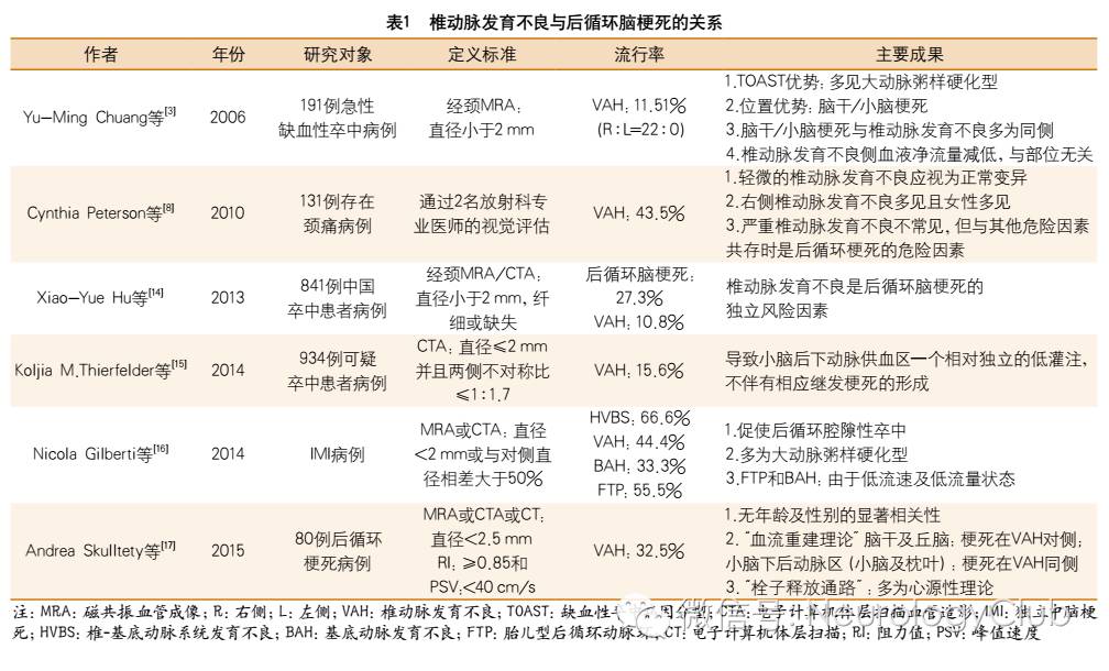 先天性椎动脉发育不良,是一种不常见的后循环胚胎发育变异,在尸检和血管造影中发生率为2%-6%。椎动脉发育不良被猜想为X染色体遗传异常。然而50%的人口存在左侧椎动脉优势,而双侧椎动脉相同者仅占人群的25%。由于这一现象普遍存在,椎动脉发育不良早期被认为是一种正常的变异。现在而言,源于临床研究与病例报告的有力证据提示尤其在与其他脑血管危险因素并存时,椎动脉发育不良有可能与后循环缺血的发生有关(表1),甚至常发生在青年人中。到目前为止,研究得知椎动脉发育不良的发生率在9.5%-44.4%,这一结果与椎动脉发育不良的定义、检测方法以及研究对象选取差异有关(表1-2),其中椎动脉发育不良的检测方法包括尸检研究、磁共振血管成像(magnetic resonance angiography,MRA)、对比增强磁共振血管造影(contrast- en hanc ed MR angiography,CE-MRA)、计算机断层扫描血管造影(computer tomography angiography,CTA)、数字减影血管造影(digital subtraction angiography,DSA)和彩色多普勒超声(color Doppler ultrasonography,CDU)等。此外,椎动脉发育不良还被认为与偏头痛、前庭神经元炎(vestibular neuronitis,UN)、椎动脉夹层(vertebral artery dissection,VAD)、眩晕和听神经紊乱及基底动脉发育不良(basilar artery hypoplasia,BAH)等相关(表3)。