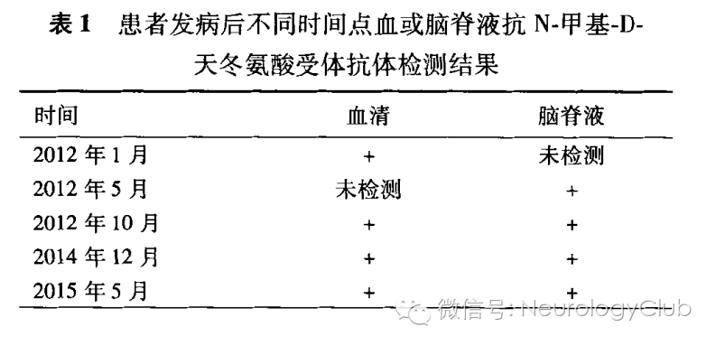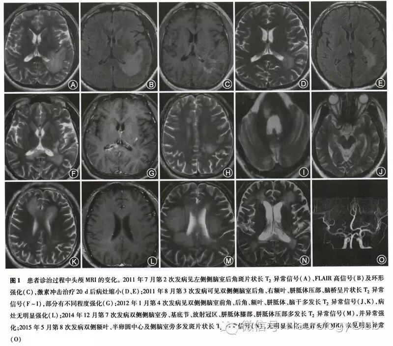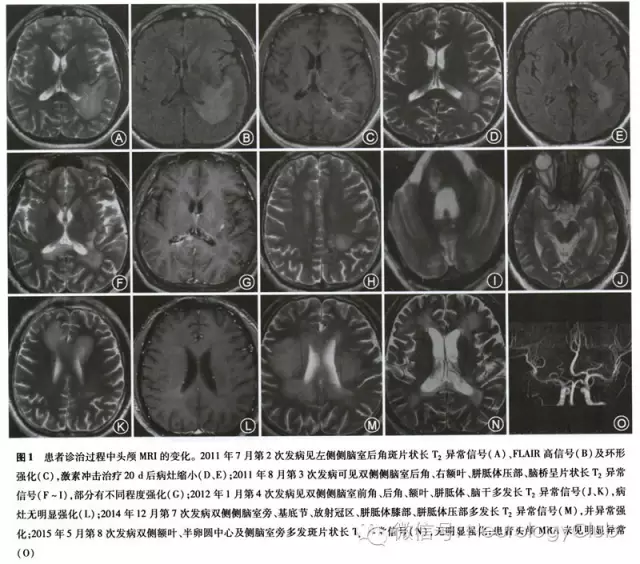患者男性,35岁,工人,因“反复发作复视、肢体抽搐、精神行为异常5年,发作性右下肢无力半年”于2015年7月12日入院。患者5年前(2010年7月)无明显诱因出现视物成双、视物模糊,后出现头痛、发热,体格检查见双眼水平眼震、双下肢病理征阳性,化验脑脊液白细胞20×10^6/L、白蛋白0.46 g/L,颅脑MRI平扫未见明显异常,诊断为“病毒性脑炎”,给予“抗病毒、激素”等治疗37 d后症状缓解出院。2011年7月患者出现发作性意识不清、四肢抽搐,行头颅MRI示“左侧侧脑室后角白质脱髓鞘改变”(图1A-C),诊断为“脱髓鞘病变”,给予甲泼尼龙冲击治疗,20d后复查头颅MRI示“左侧侧脑室后角周围白质内病灶较前范围减小,考虑脱髓鞘病变可能大”(图1D、E),遗留性格改变、情绪易波动。2011年8月再次出现视物成双,头颅MRI示“双侧侧脑室后角、右额叶、胼胝体压部、脑桥异常信号,部分有不同程度强化”(图1F-I),再次甲泼尼龙冲击治疗2个月后视物成双缓解,遗留计算力减退。2012年1月再次出现发作性肢体抽搐,每次持续数秒钟缓解,每天发作数次,伴有发作性精神行为异常,烦躁、易哭,复查头颅MRI示“双侧侧脑室前角、后角、额叶、胼胝体、脑干多发异常信号”(图1J-L),诊断为“脱髓鞘病变、脑炎后遗症、器质性精神障碍”,给予甲泼尼龙冲击及抗癫痫治疗2个月余,症状缓解。2012年5月再次出现视物成双、视物模糊,经甲泼尼龙冲击治疗后缓解。2012年10月复发视物成双,行头颅MRI示“双侧侧脑室周围白质区、第四脑室左旁多发异常信号”,再次给予甲泼尼龙冲击后症状缓解。2014年12月患者出现右下肢无力,计算力减退,右下肢肌力III-级,右侧查多克征、巴宾斯基征(+),余神经系统体检未见明显异常,复查头颅MRI平扫+强化示“双侧侧脑室旁、基底节、放射冠区、胼胝体膝部、胼胝体压部多发异常强化信号”(图1M),首次化验血和脑脊液抗NMDAR抗体均为(+),并化验前期复发时冻存血或脑脊液标本的抗NMDAR抗体(表1),诊断为“抗NMDAR脑炎”,经激素+免疫球蛋白冲击治疗后症状缓解。2015年5月患者再次出现肢体抽搐、右下肢无力,体格检查:高级智能减退,右下肢肌力Ⅳ级,余神经系统体检及心肺腹部体检未见明显异常,复查头颅MR平扫+强化示“双侧额叶、半卵圆中心及侧脑室旁多发斑片样异常信号影”(图1N),复查血和脑脊液抗NMDAR抗体均为(+),给予免疫球蛋白冲击治疗后症状缓解,并给予硫唑嘌呤口服。患者既往体健,家族中无类似症状者。患者2014年12月诊治过程中先后进行了7次腰椎穿刺检查,脑脊液白细胞数0-24×10^6/L,脑脊液蛋白0.37-0.80g/L,余脑脊液常规、生化、免疫球蛋白、髓鞘碱性蛋白、寡克隆区带电泳、新型隐球菌、抗酸杆菌及细菌、真菌培养及IgG指数均为正常。诊疗过程中多次化验血常规、肝功能、肾功能、生化、甲状腺功能五项、心肌酶、凝血检验、红细胞沉降率、抗O、类风湿因子、C反应蛋白、免疫球蛋白、补体、抗核抗体谱、抗中性粒细胞胞质抗体、肿瘤抗神经系统抗体谱、血肿瘤标志物谱、乙型肝炎病毒、丙型肝炎病毒、人类免疫缺陷病毒、梅毒螺旋体、TORCH十项、血和脑脊液水通道蛋白4(aquaporin-4,AQP4)、抗神经节苷脂、髓鞘少突胶质细胞糖蛋白抗体(myelin oligodendroeyte glycoprotein,MOG)均正常。脑电图示轻中度异常(全头区可见弥漫性θ波)。先后3次视觉诱发电位检查示“双眼分别刺激左、中、右枕记录,视觉诱发电位P100潜伏期均延长”。脊髓、视神经MRI平扫未见明显异常。心电图正常。彩超检查肝、胆、胰、脾、双肾、输尿管、膀胱、前列腺均未见明显异常。胸部CT示两肺纹理增多。2015年7月全身氟代脱氧葡萄糖(FDG)-PET示“双侧半卵圆中心及放射冠区多发斑片状稍低密度灶,FDG代谢未见明显异常,多发性硬化(MS)可能;前列腺腺体两侧FDG代谢异常增高,建议前列腺B超检查及总前列腺特异抗原(tPSA)、游离前列腺特异抗原(fPSA)检查”。复查前列腺B超未见明显异常,复查tPSA、fPSA均正常。