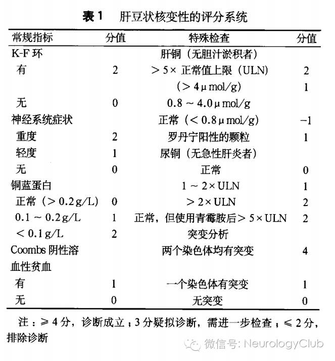 WD的诊断需结合患者的临床表现(尤其是肝脏和神经精神症状)、角膜K-F环、血清铜蓝蛋白及血清铜和24小时尿铜等综合判断。欧洲指南提出将评分系统应用于WD的诊断(表1)。