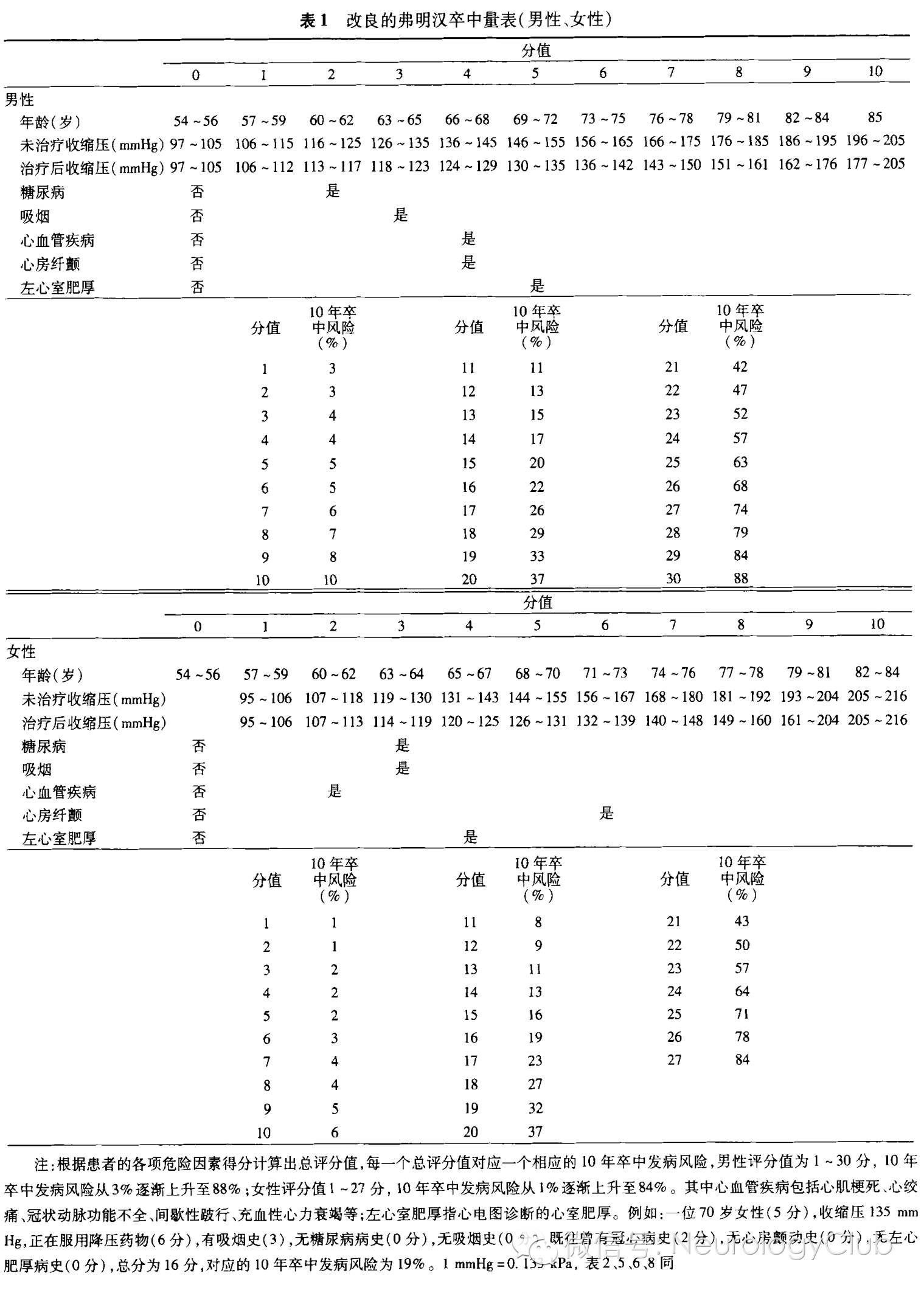 1. 改良的弗明汉卒中量表(Framingham Stroke Profile,表1):弗明汉卒中量表是最早提出并得以广泛应用的简易卒中风险评估工具,由Wolf等于1991年首先在弗明汉研究中提出,研究人群主要为来自美国马萨诸塞州弗明汉小镇的居民,研究筛选出年龄、收缩压、降压治疗、糖尿病史、吸烟、心血管病病史、心房颤动史及心电图诊断的左心室肥厚等预测因子并赋予分值权重,建立了风险评分值与卒中发病率的数学模型,预测未来10年卒中发病风险。由于血压水平受药物治疗的影响较大,D’Agostino等根据接受降压治疗前后收缩压水平,对该风险积分规则进行调整后,建立了改良的弗明汉卒中量表,进一步提高了模型对卒中发病风险的预测能力。国内验证显示该量表能较好预测卒中发病风险[曲线下面积(AUC):男性0.726;女性0.656],但在一定程度上高估了研究人群的实际卒中发病率,同时由于量表中缺乏一些重要的卒中预测因素,可能存在一定局限性。国内学者也建立了一些基于国人数据的缺血性心脑血管疾病发病风险评估量表,但未获广泛应用。2011年美国卒中一级预防指南建议对每一例具有卒中危险因素暴露的个体使用风险评估量表(如改良的弗明汉卒中量表)进行卒中风险评估。